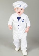 This gorgeously cute 4 piece Christening Sailor Suit is perfectly designed to ensure your baby’s day is a memorable one. Made from 100% Polyester, this christening suit features a pair of white elasticated trousers, a white shirt with full sleeve and collar, a beautiful white waistcoat with navy embroidery and navy buttons, a matching navy cravat and a super adorable white hat with navy embroidery.