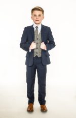 This Stylish Navy suit is incredibly eye catching with its Chequered Waistcoat and matching tie. The design of the waistcoat has various lines of grey and blue tinsel which makes this waistcoat the dominant piece of the suit. Subtle hints of blue running throughout the pattern compliment the navy jacket and trousers. The whole suit is finished off with a crisp white shirt