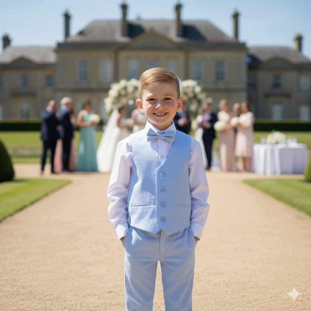 This pale blue suit offers a crisp, tailored look with a button-up shirt, coordinating trousers, and a matching waistcoat. The pale blue bow tie completes the ensemble, combining style and comfort for any formal occasion. A timeless choice for your little one to look smart and stylish.