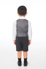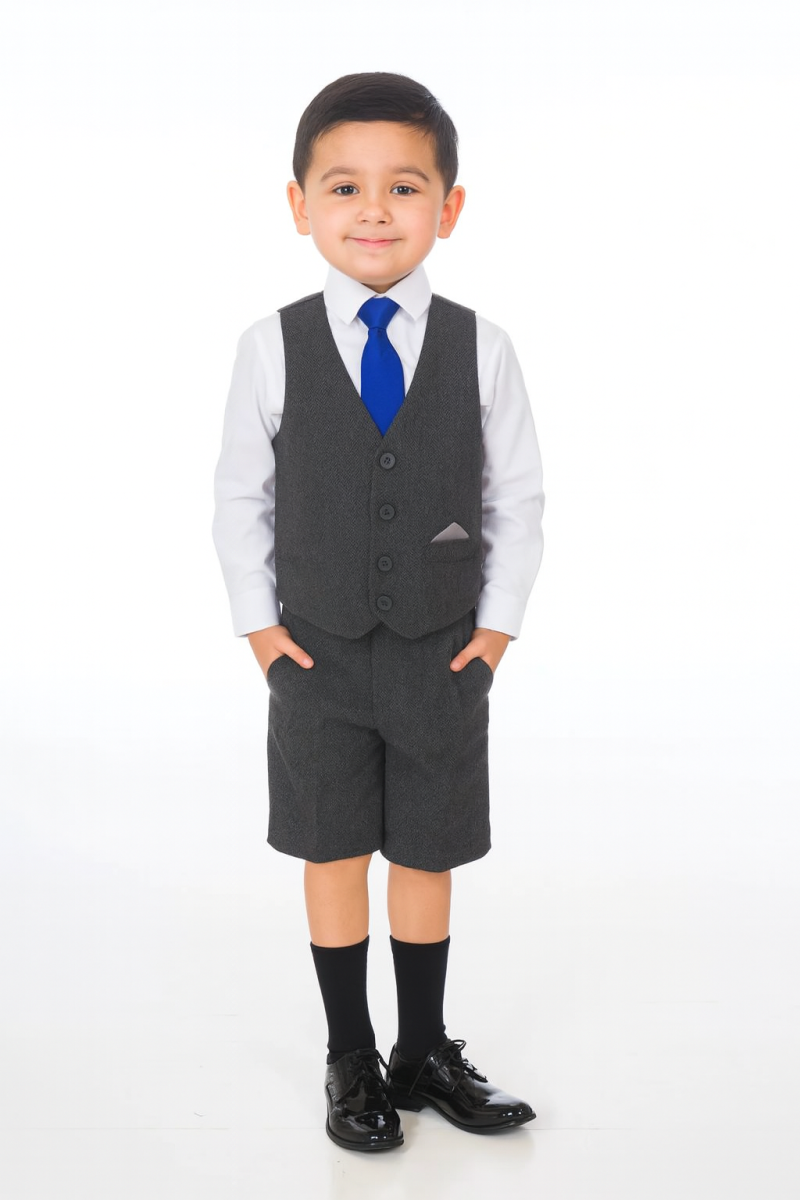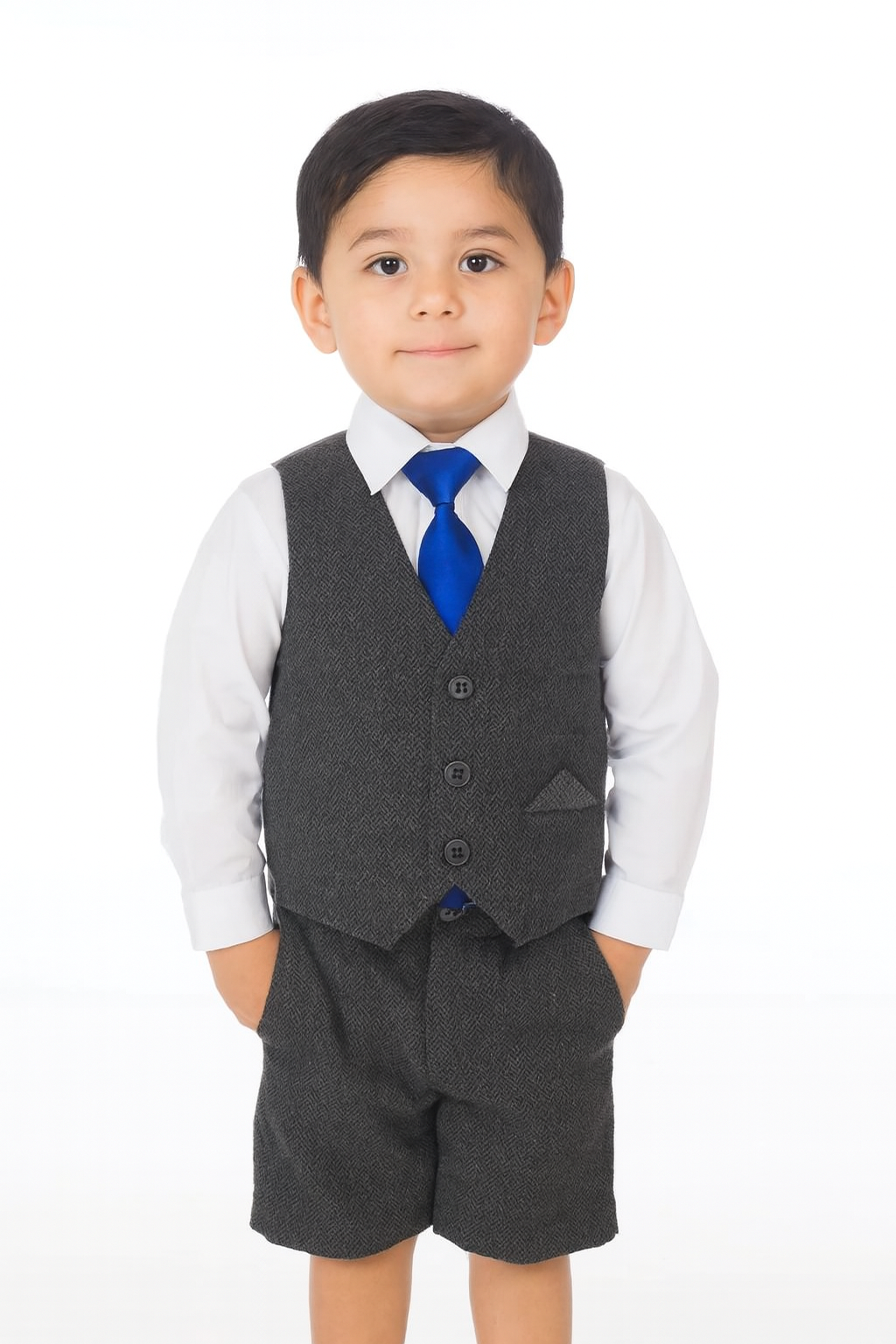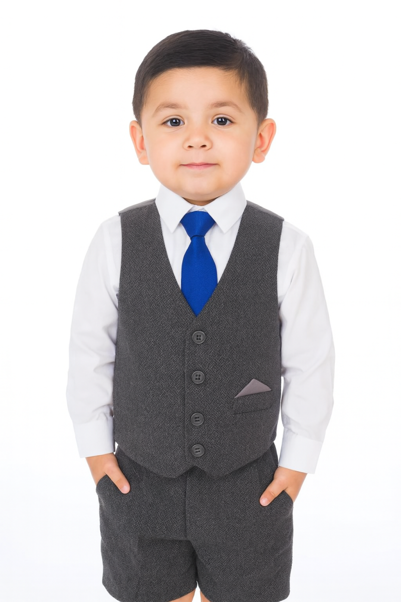 A stylish grey herringbone tweed short suit designed to enhance your young boy’s appearance and promote a polished, refined look. Crafted from high-quality, elegant grey herringbone tweed, this suit includes a fitted waistcoat and trousers. A crisp white shirt and a coordinating blue tie complete the sophisticated ensemble.