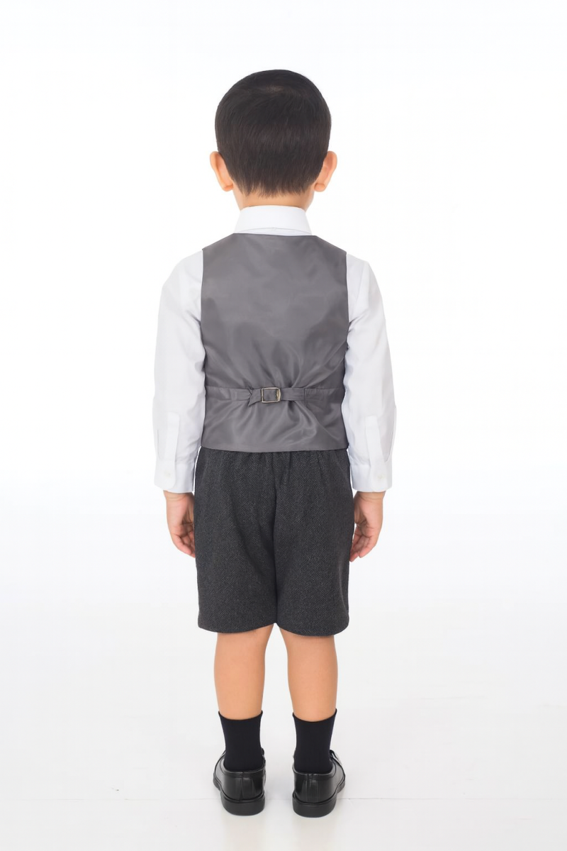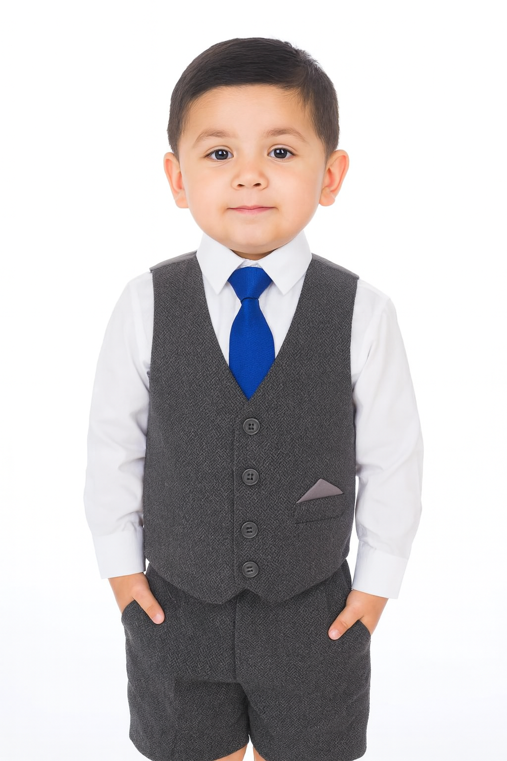 A sophisticated grey herringbone tweed short suit, ideal for presenting your young boy as a polished young gentleman. This high-quality ensemble includes a tailored waistcoat and matching trousers in classic grey herringbone tweed. Completed with a crisp white shirt and coordinating blue tie, this outfit offers a refined and timeless appearance.