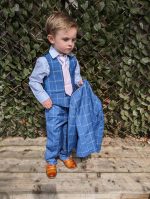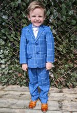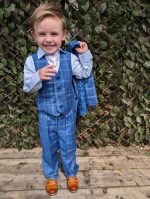 Lockdown the look in this super stylish boys 5 piece blue check suit. The crisp white shirt and light pink tie contrast flawlessly with the bright blue suit colouring creating the perfect stand out outfit.