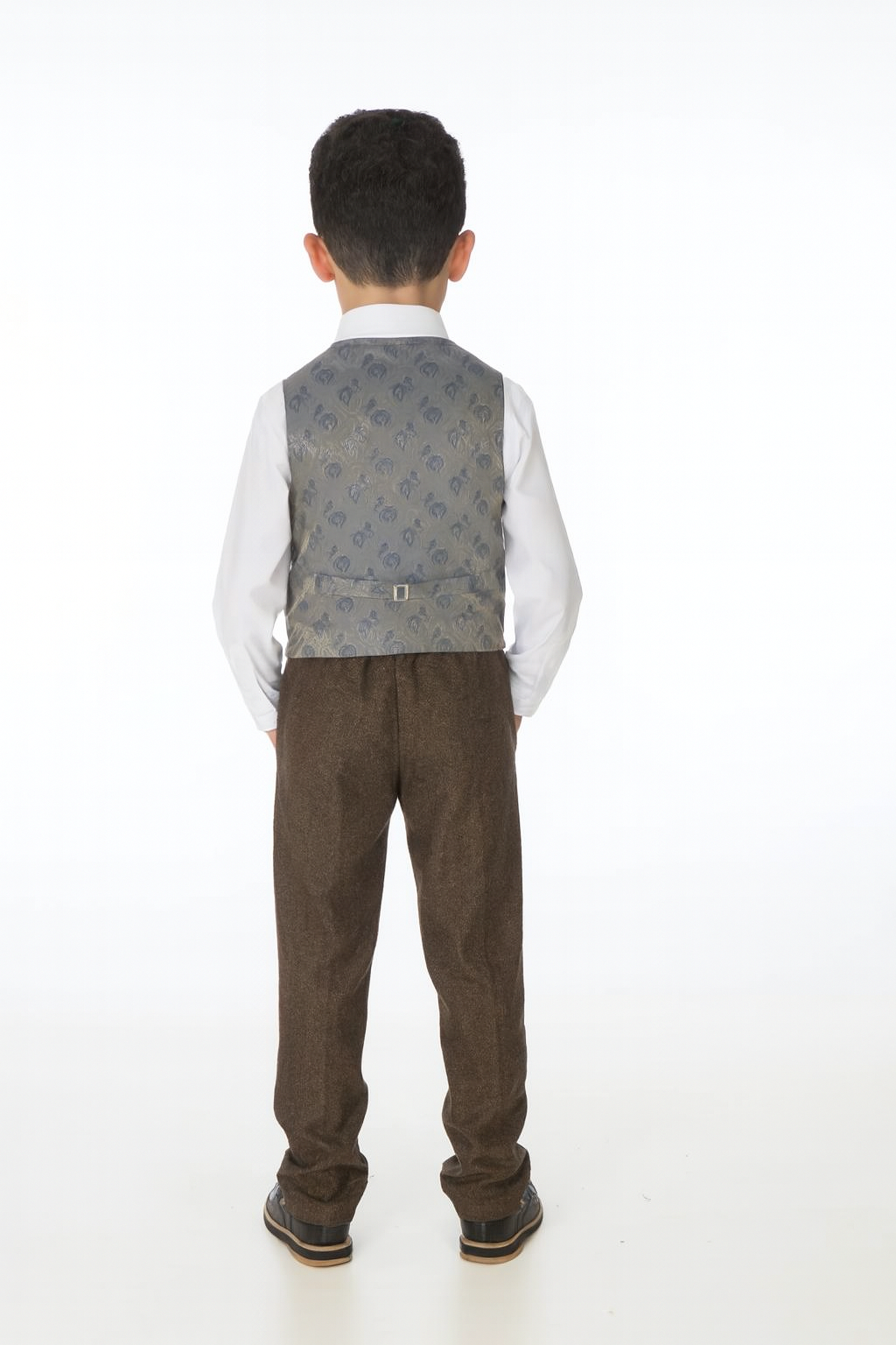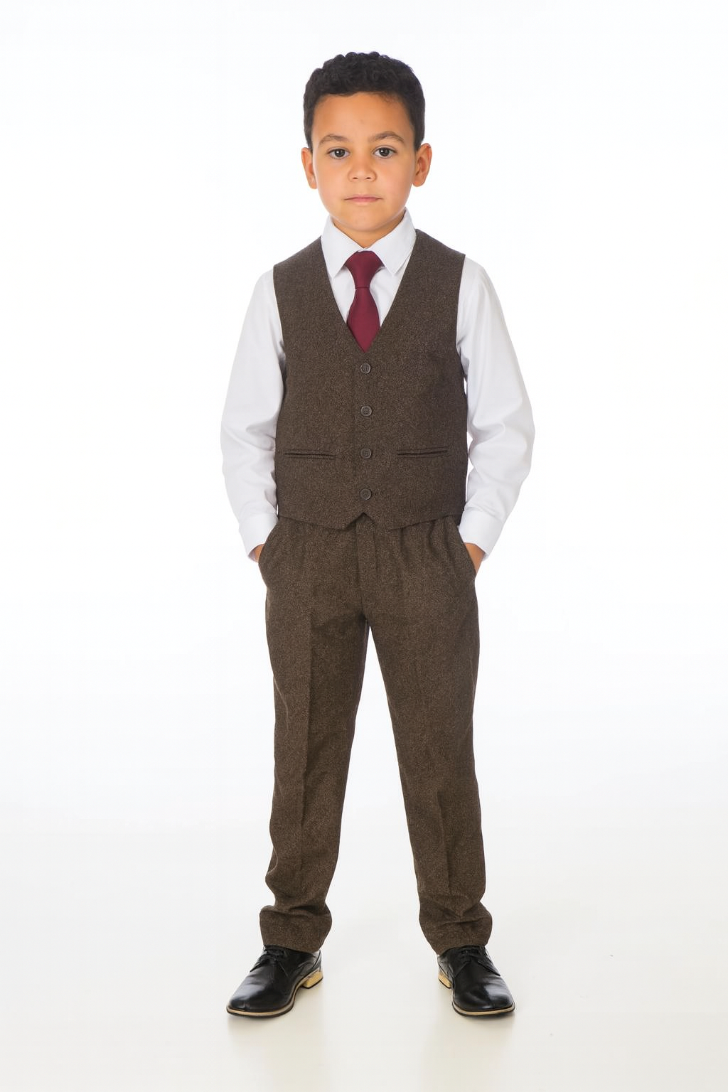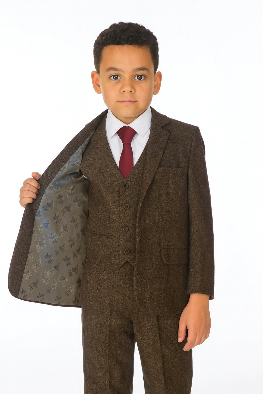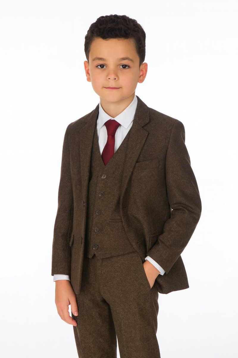 This sophisticated dark brown tweed suit is ideal for making a distinguished impression at any special event. Crafted from high-quality materials, it features a tailored tweed jacket, a matching waistcoat, and trousers. The ensemble is complemented by a crisp white shirt and a burgundy tie, completing a refined and professional appearance.