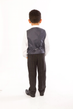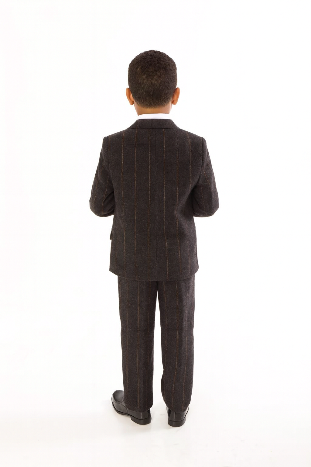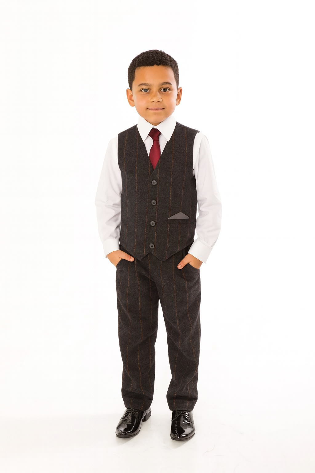 A sophisticated grey check tweed suit, ideal for dressing your young boy as a refined gentleman. This high-quality ensemble includes a carefully tailored tweed jacket, a coordinating waistcoat, and matching trousers in an elegant grey check pattern. The outfit is complemented by a crisp white shirt and a burgundy tie, creating a polished and professional appearance.