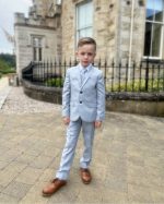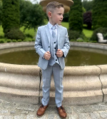 The most perfect summer suit, a premium luxury outfit by designers Milano Mayfair. This complete 5 piece slim fit suit comes with a 2 Button Jacket, trousers with adjustable waist, matching 4 button waistcoat, crisp white shirt and a tie to complement the suit. Make your little gent look stunning and make every moment memorable with this suit. This premium suit comes in a Milano Mayfair suit bag.