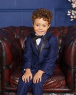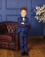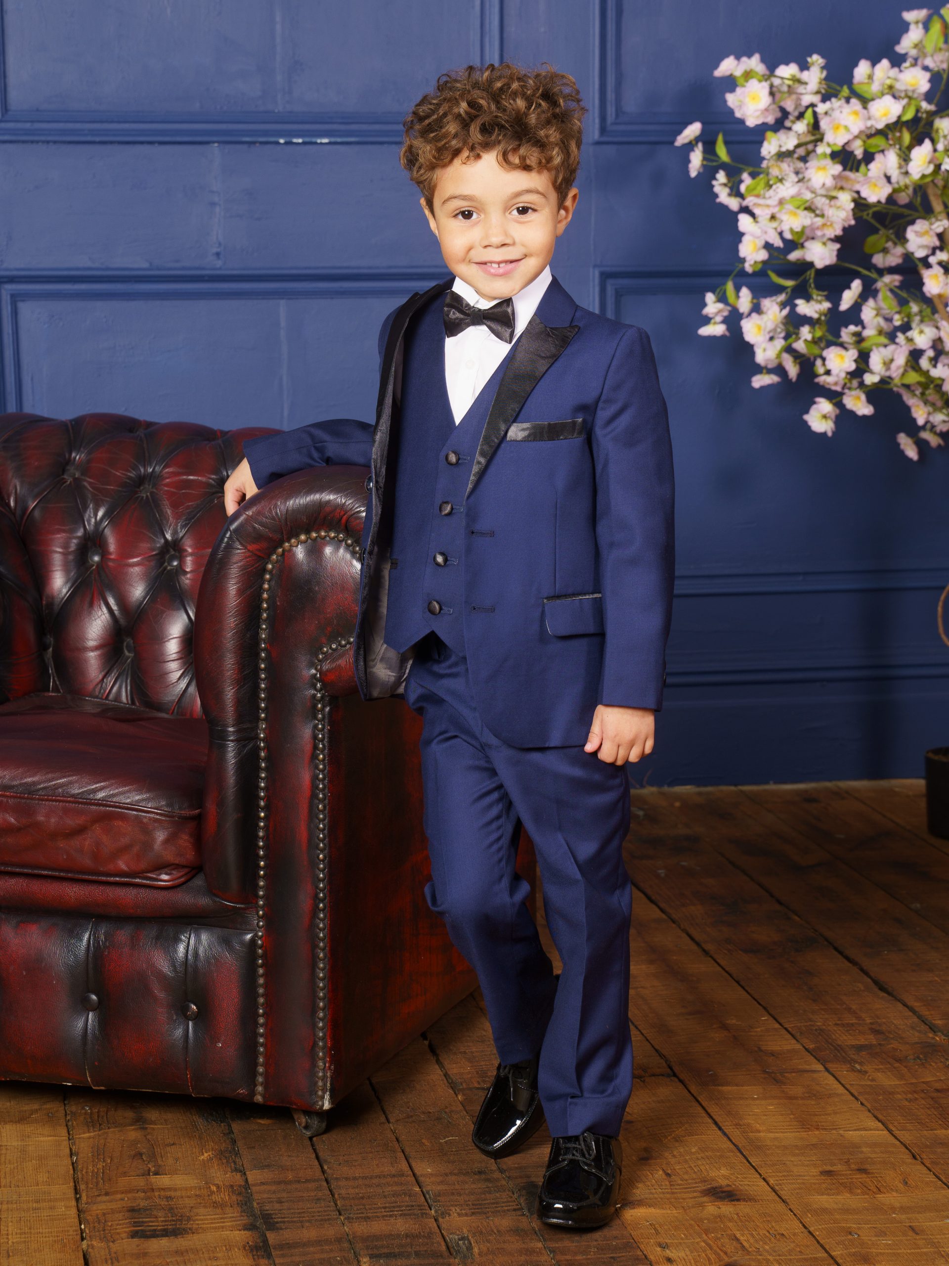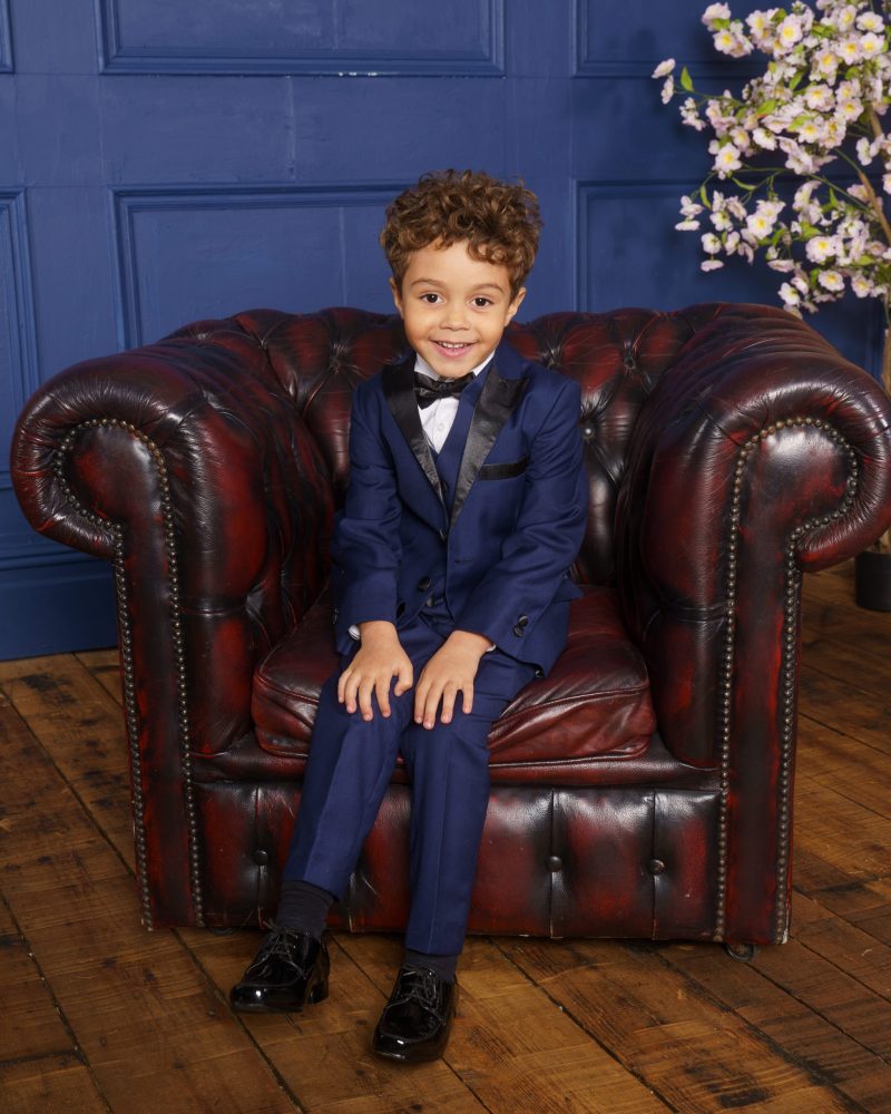 A premium luxury suit by Milano Mayfair. This complete five-piece slim-fit ensemble includes a two-button jacket, trousers with an adjustable waist, a matching four-button waistcoat, a crisp white shirt, and a bow tie to coordinate with the suit. Perfect for making a distinguished impression on any occasion, this refined outfit is presented in a Milano Mayfair suit bag.