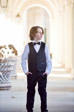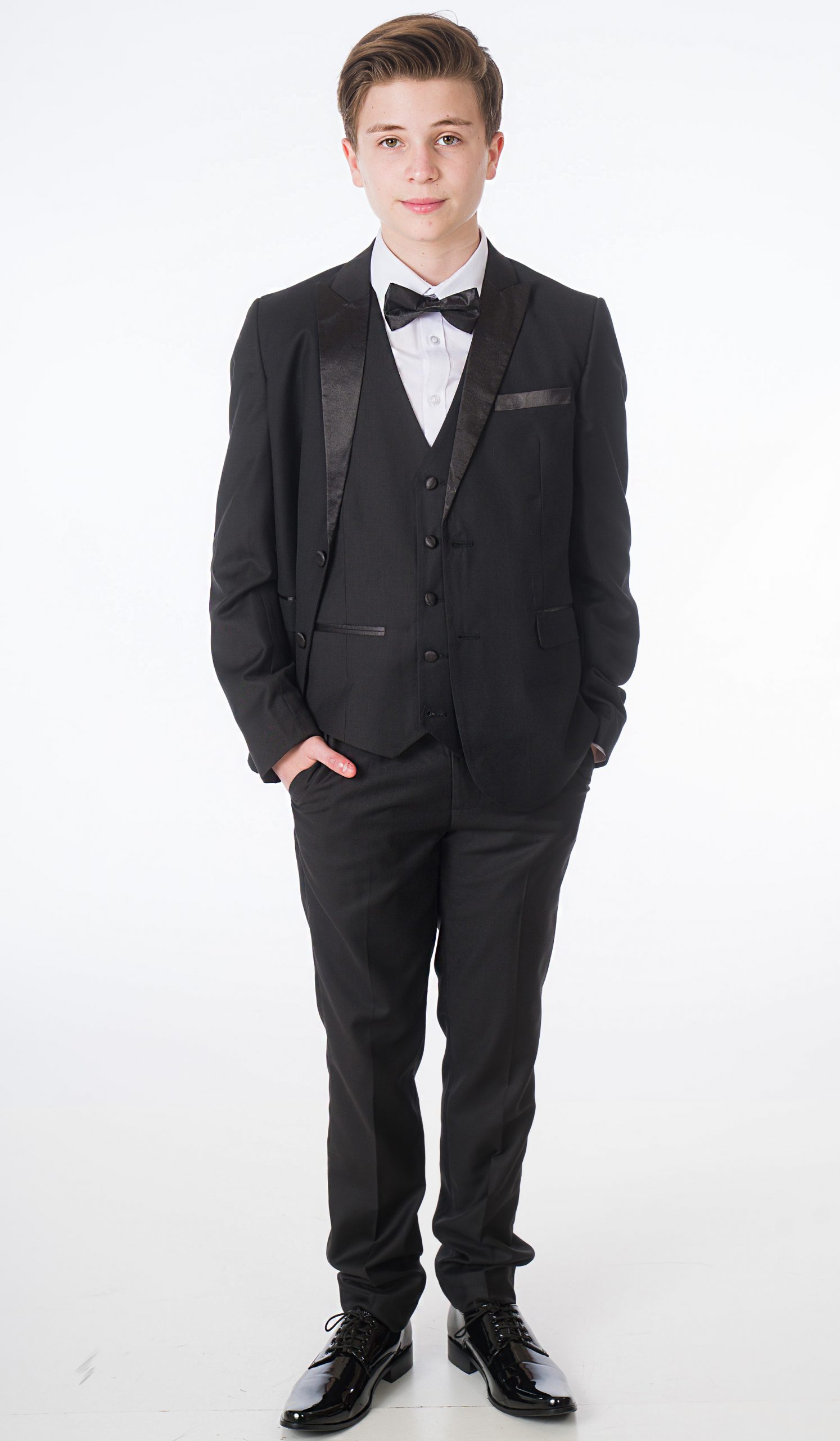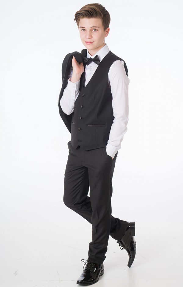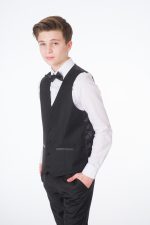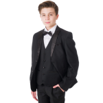 A premium luxury suit by designers Milano Mayfair. This complete 5-piece slim fit suit includes a 2-button jacket, trousers with adjustable waist, matching 4-button waistcoat, a crisp white shirt, and a bow tie to complement the ensemble. Ensure your young gentleman looks stylish and makes every occasion special with this suit. The premium suit is presented in a Milano Mayfair suit bag.