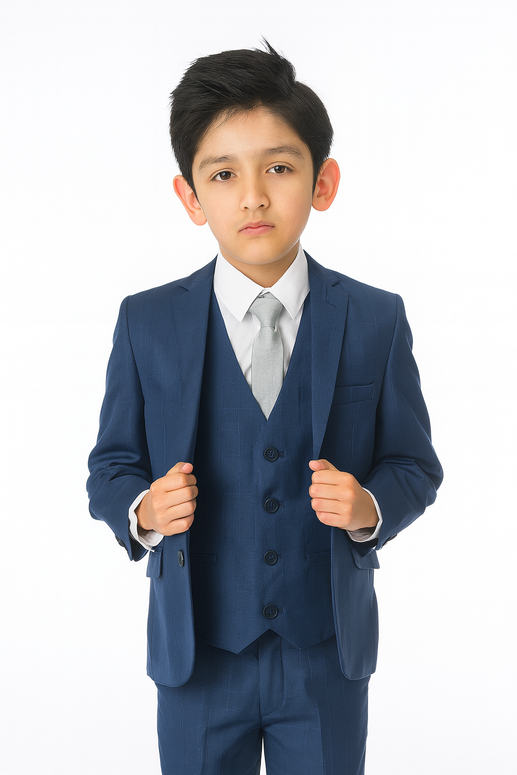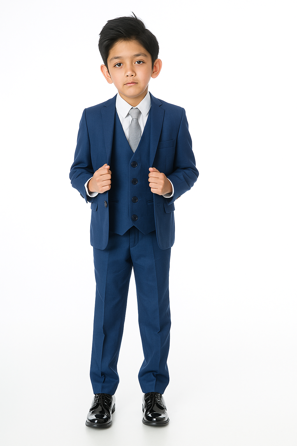 A premium luxury suit by designers Milano Mayfair. This complete 5 piece slim fit suit comes with a 2 Button Jacket, trousers with adjustable waist, matching 4 button waistcoat, crisp white shirt and a tie to complement the suit. Make your little gent look stunning and make every moment memorable with this suit. This premium suit comes in a Milano Mayfair suit bag.