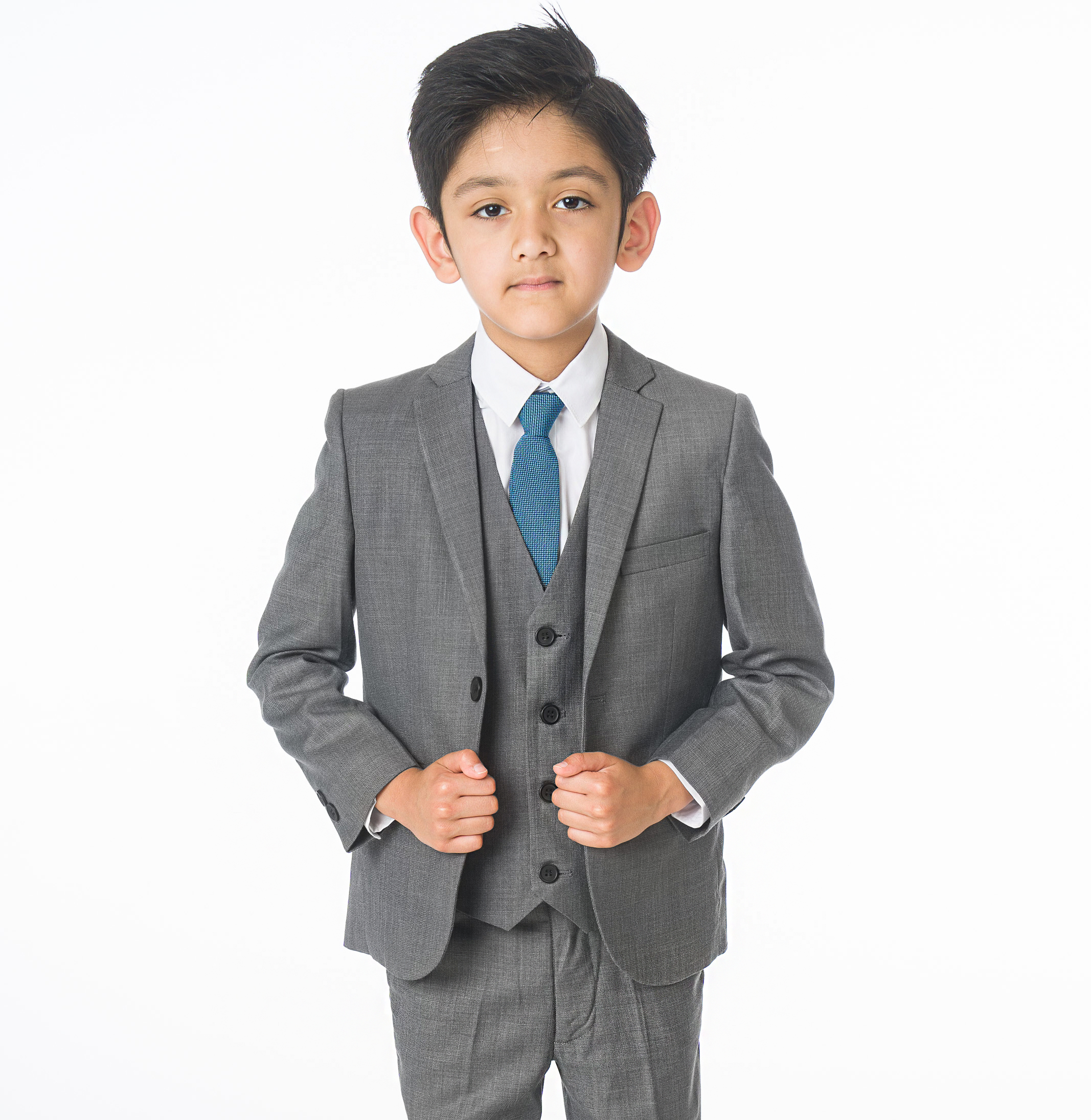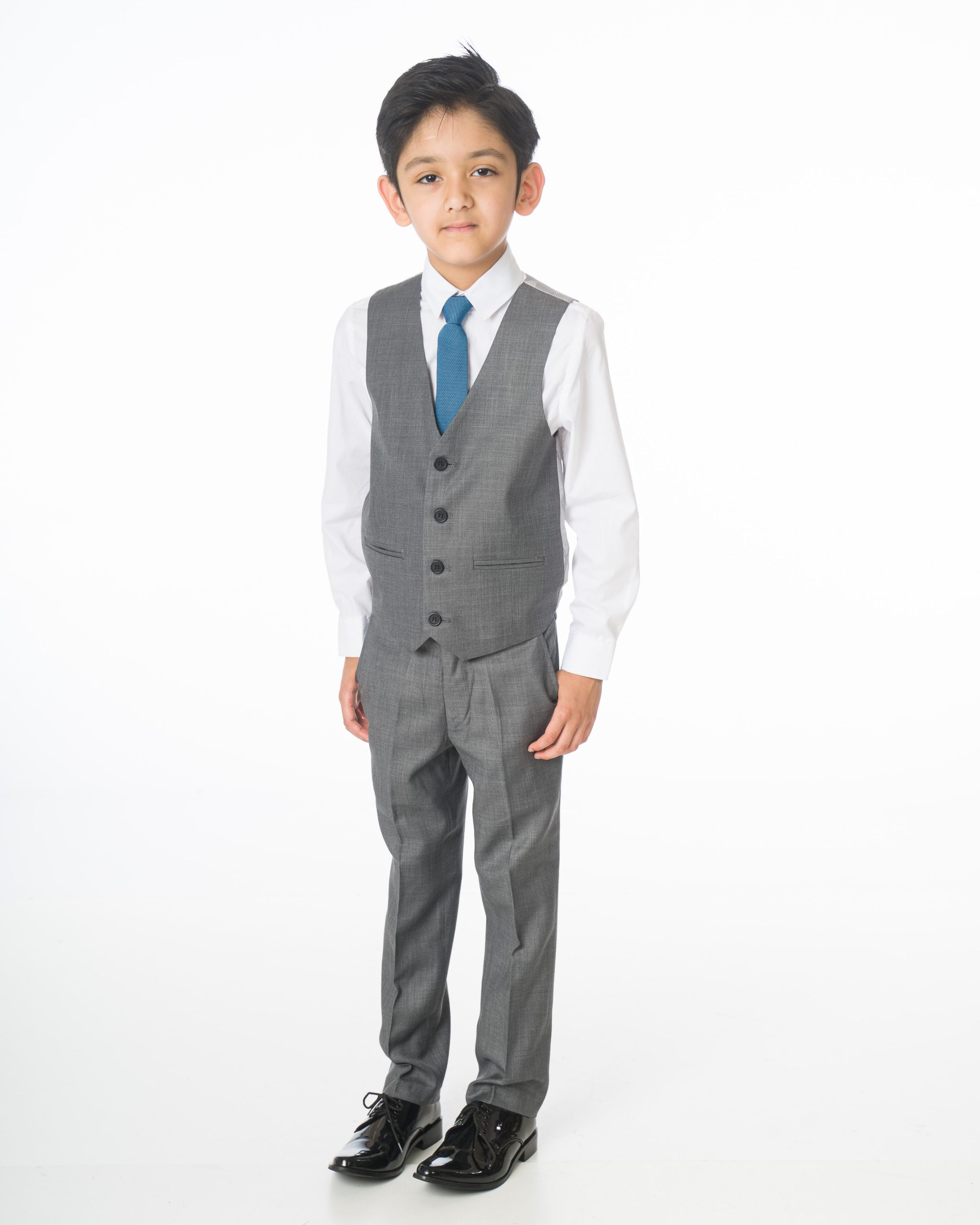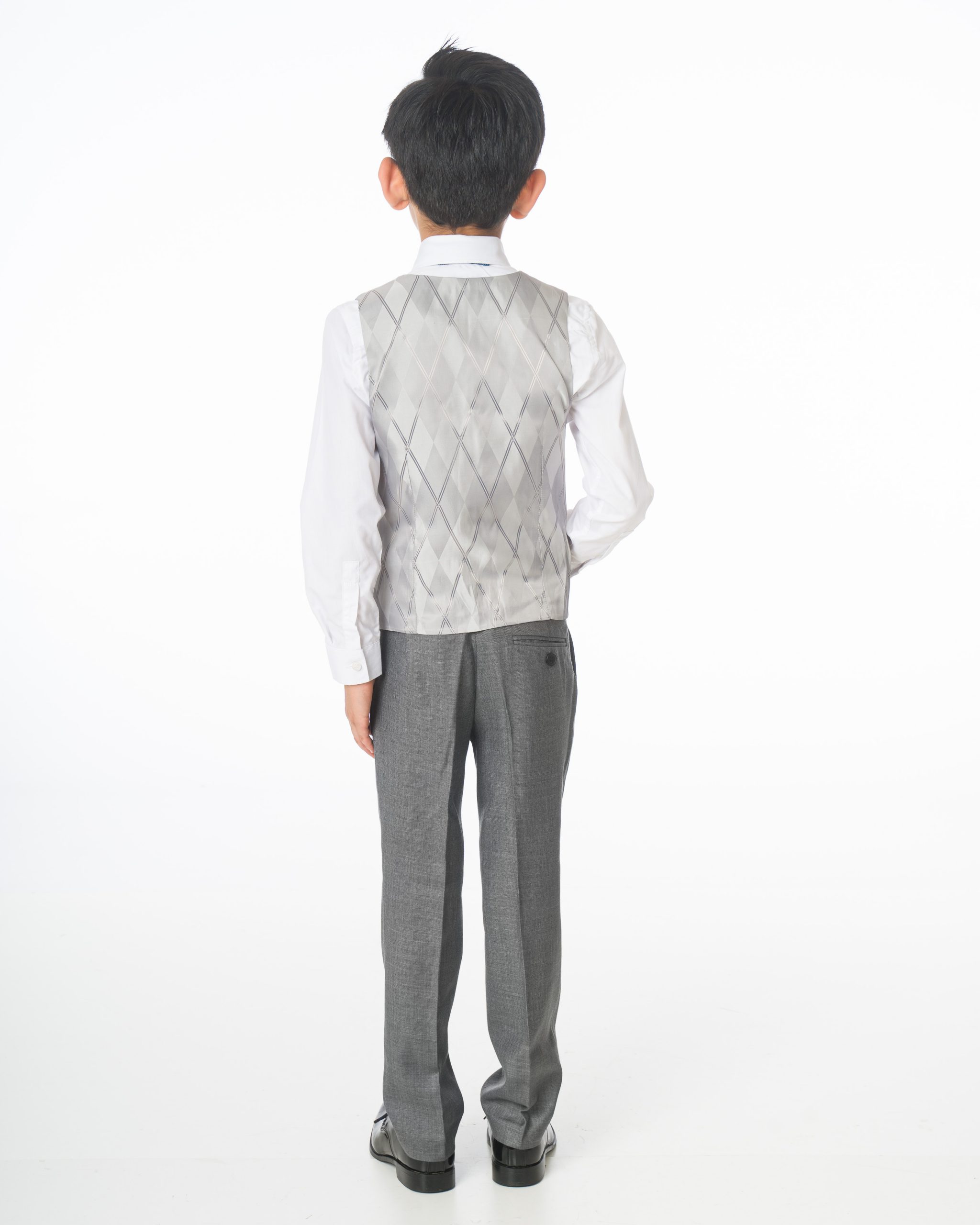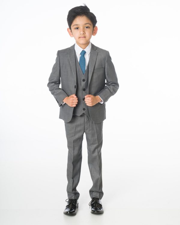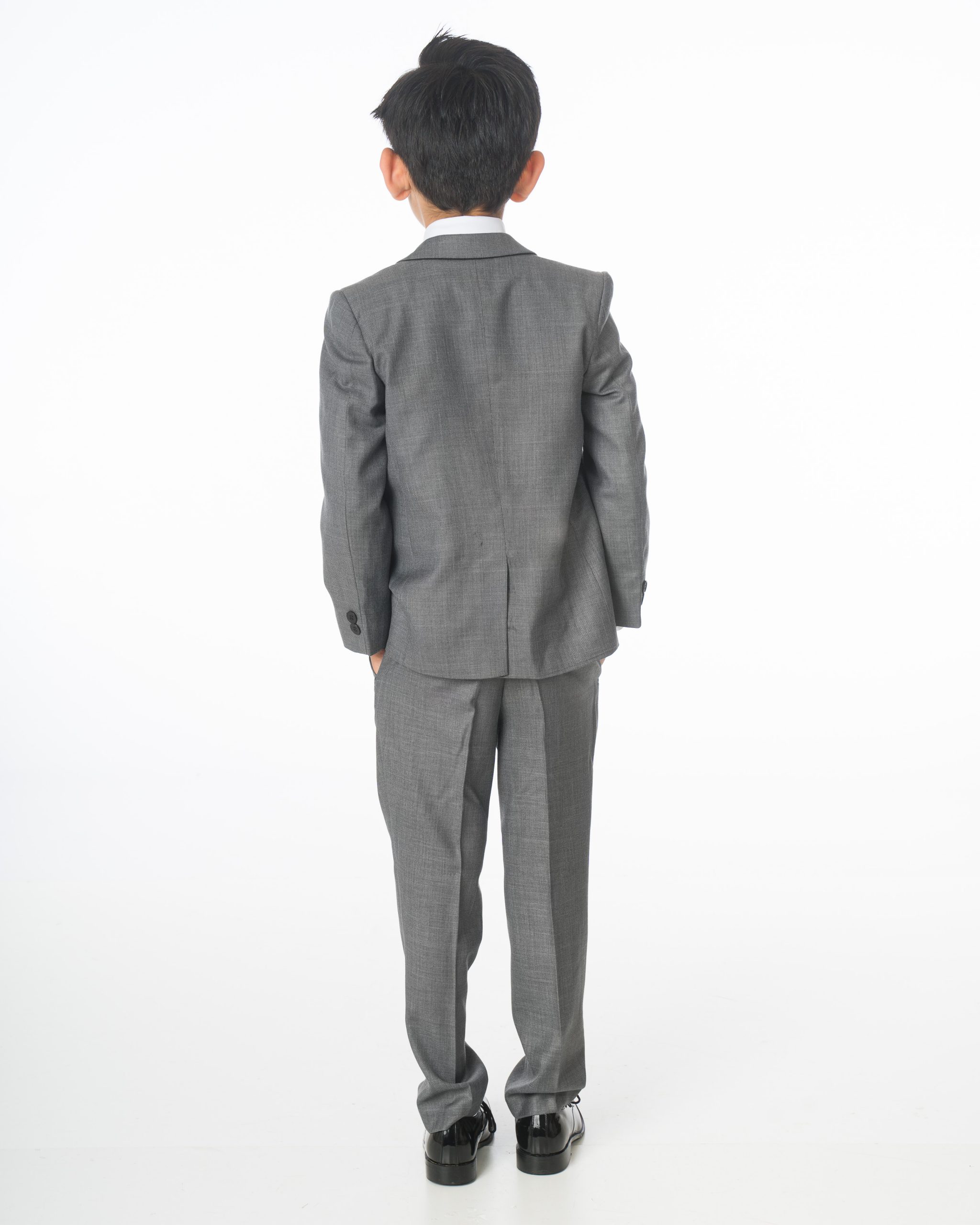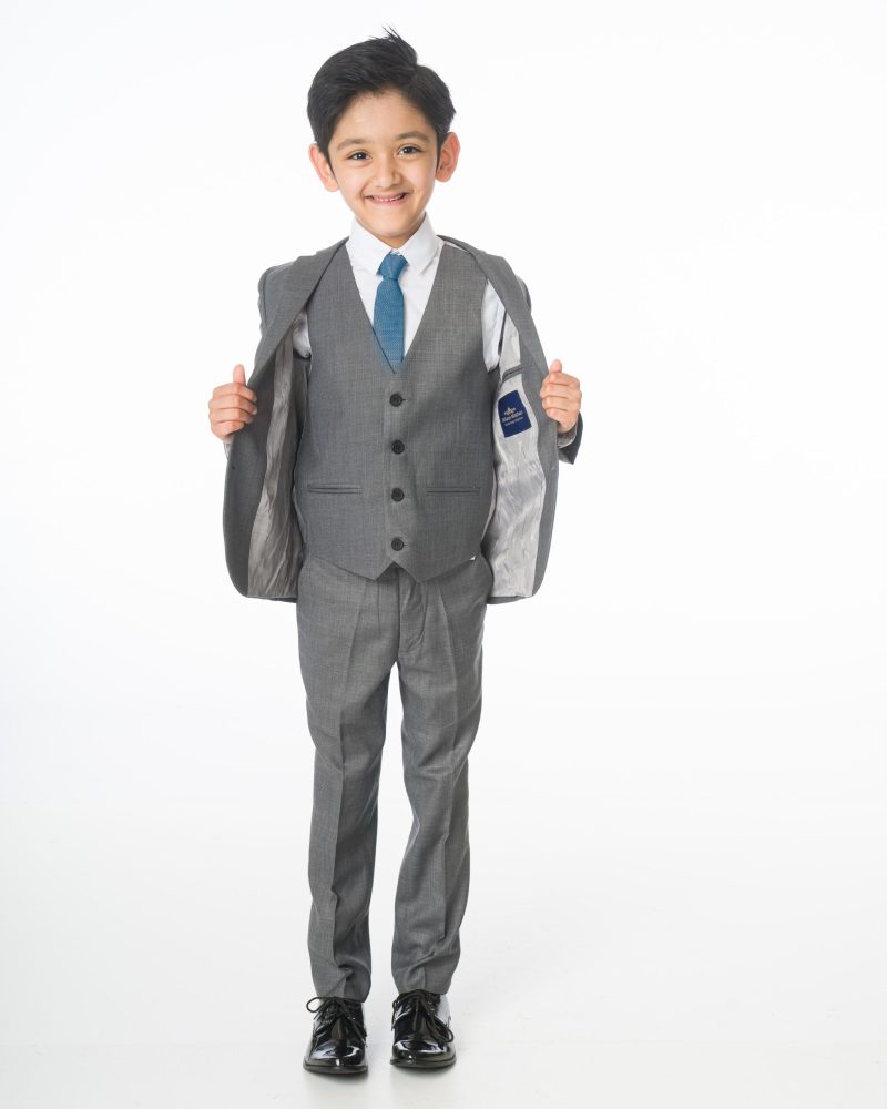A high-quality luxury suit designed by Milano Mayfair. This complete five-piece slim-fit ensemble includes a two-button jacket, trousers with an adjustable waist, a matching four-button waistcoat, a crisp white shirt, and a coordinating tie. Ensure your young gentleman looks sharp and makes every occasion special with this suit. The premium quality is complemented by its presentation in a Milano Mayfair suit bag.