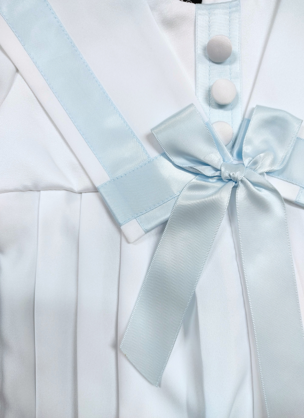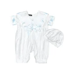 This outfit is ideal for christening occasions. Featuring a luxurious light blue satin finish, it ensures your child embodies elegance. The romper-style design allows for easy fastening at the horizontal seam between the legs and at the back, providing ample room for comfortable movement without feeling restricted.