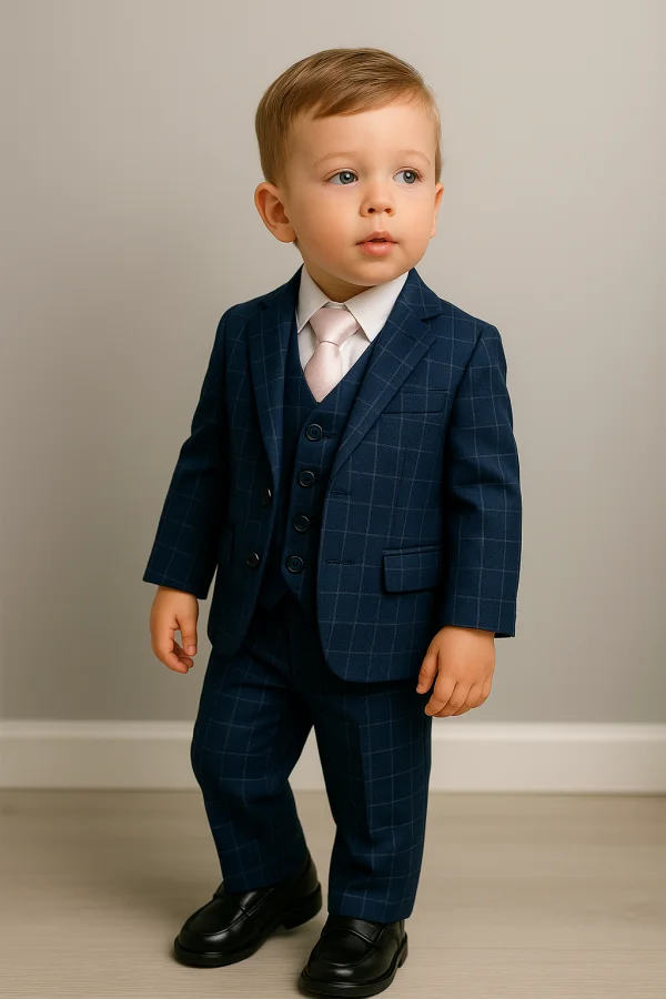 Elevate your appearance with this sophisticated navy check suit. The crisp white shirt and light pink tie complement the rich navy fabric, creating an elegant and standout ensemble.