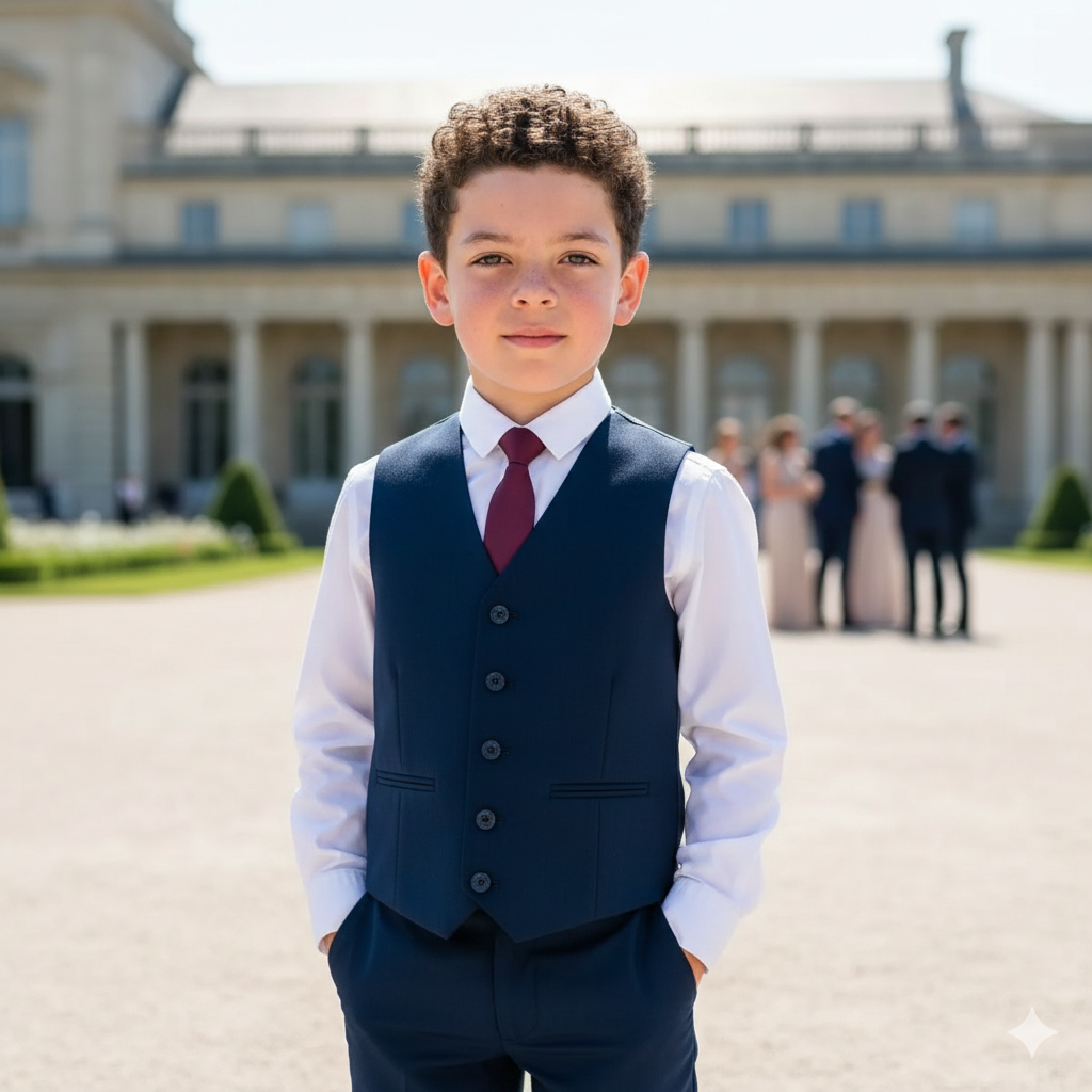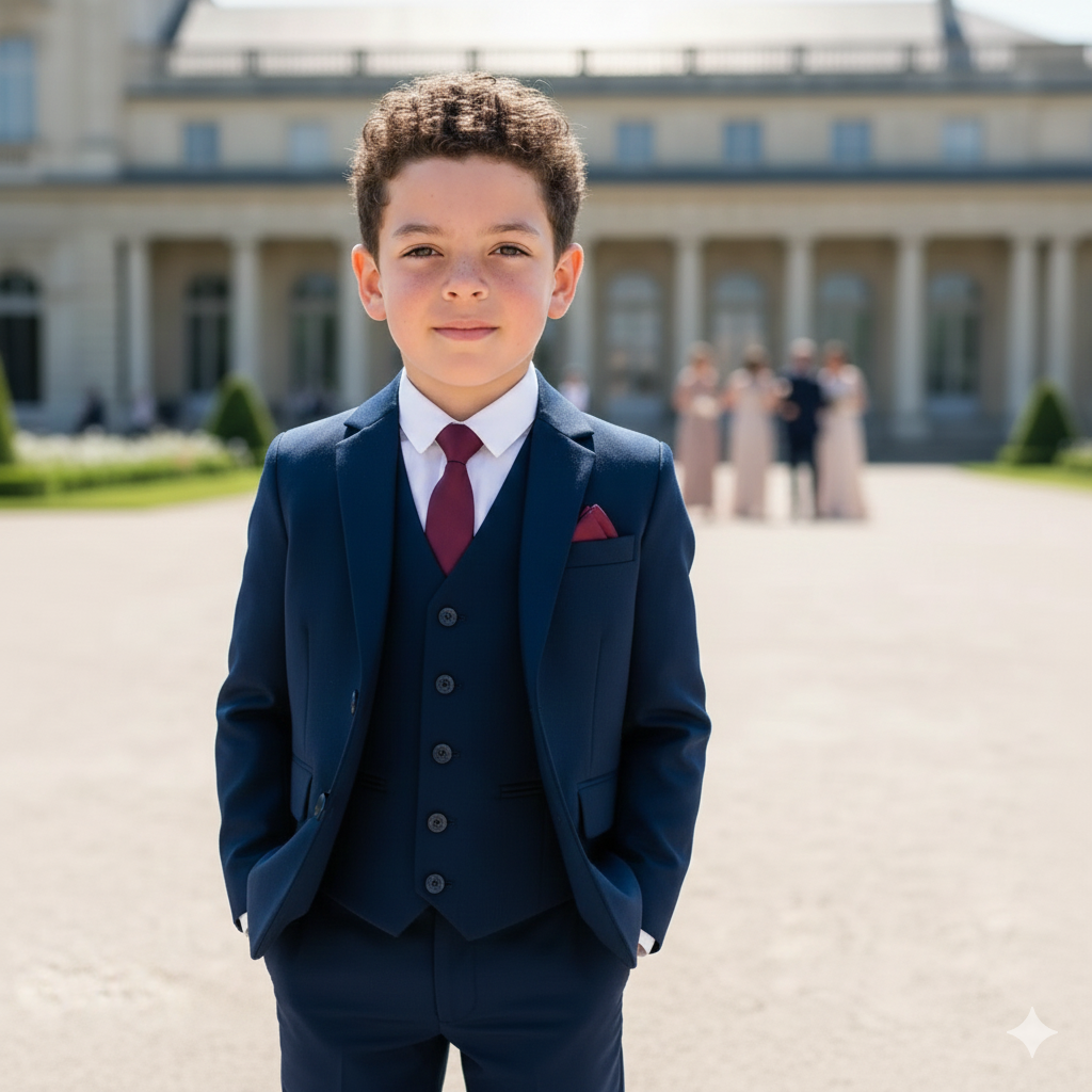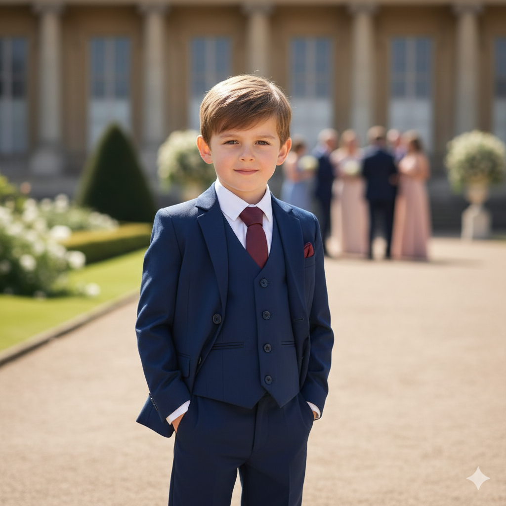 Look sharp in our premium 5 piece Navy suit. A sleek slim fit in a rich blue colouring which is complimented with a maroon tie and pocket square. Styled with a crisp white shirt to complete the look.  A wardrobe essential for your child.