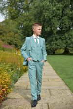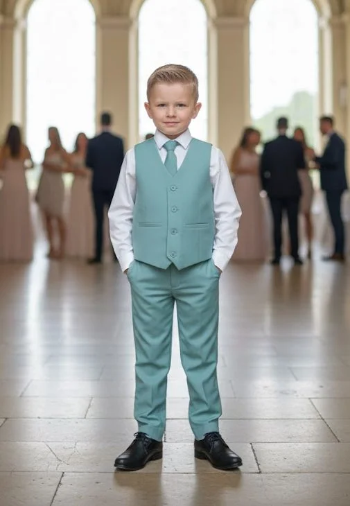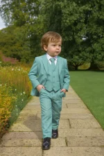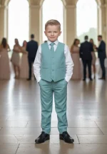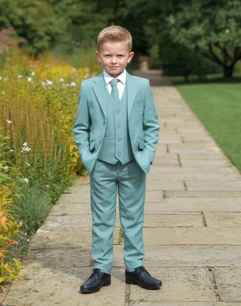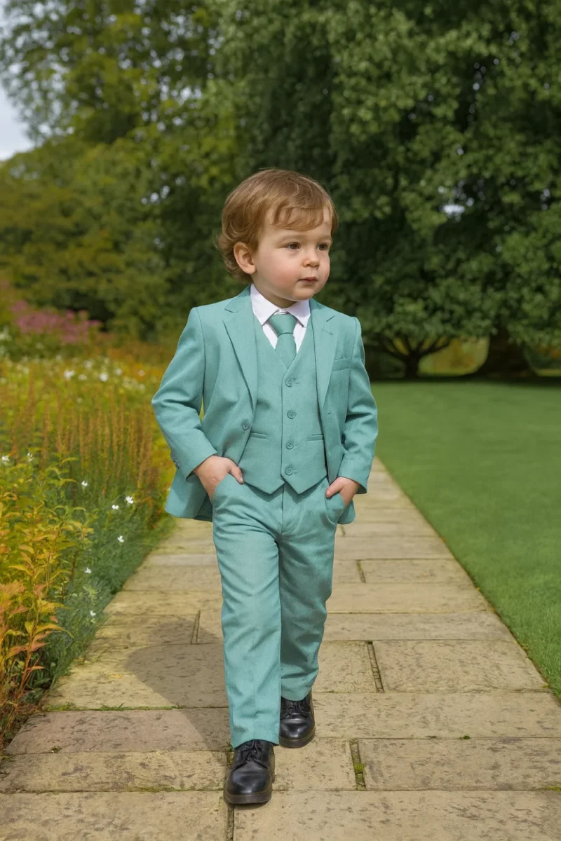 The boys’ 5-piece Sage Premium Suit is a stylish and sophisticated outfit, crafted from a soft sage green fabric. It includes a jacket, waistcoat, trousers, a crisp white shirt, and a matching sage tie, creating a cohesive and polished appearance. The subtle green tone offers a fresh and contemporary take on traditional formalwear, making it suitable for weddings, parties, or other special events. This suit combines comfort with elegance, ensuring a sharp and charming look.