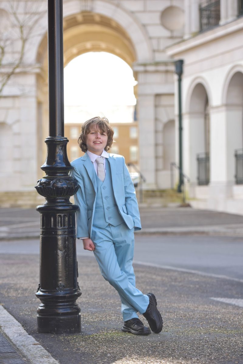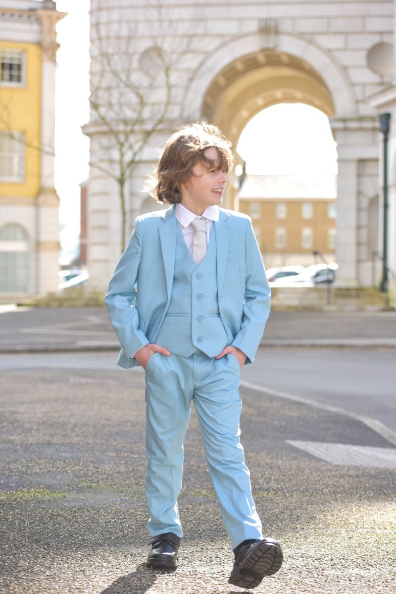 This set includes a sleek two-button sky blue suit jacket, a matching fully lined blue waistcoat with an adjustable clasp for a perfect fit, a classic white long-sleeve collar shirt, steel blue elasticated trousers, and a plain grey tie for the finishing touch.