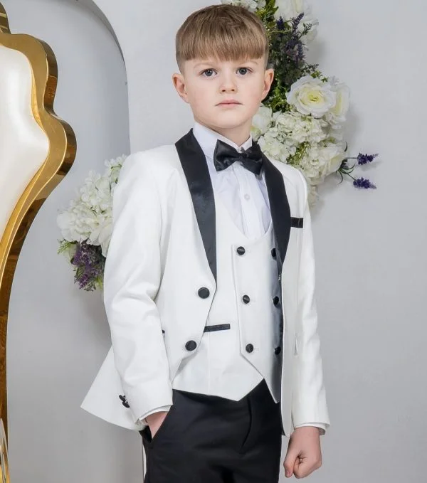 A premium luxury suit by designers Milano Mayfair. This complete 5-piece slim-fit ensemble includes a two-button white jacket, trousers with an adjustable waist, a matching four-button waistcoat, a crisp white shirt, and a bow tie to complement the look. Ensure your young gentleman appears stylish and create memorable moments with this suit. The premium suit is presented in a Milano Mayfair suit bag.