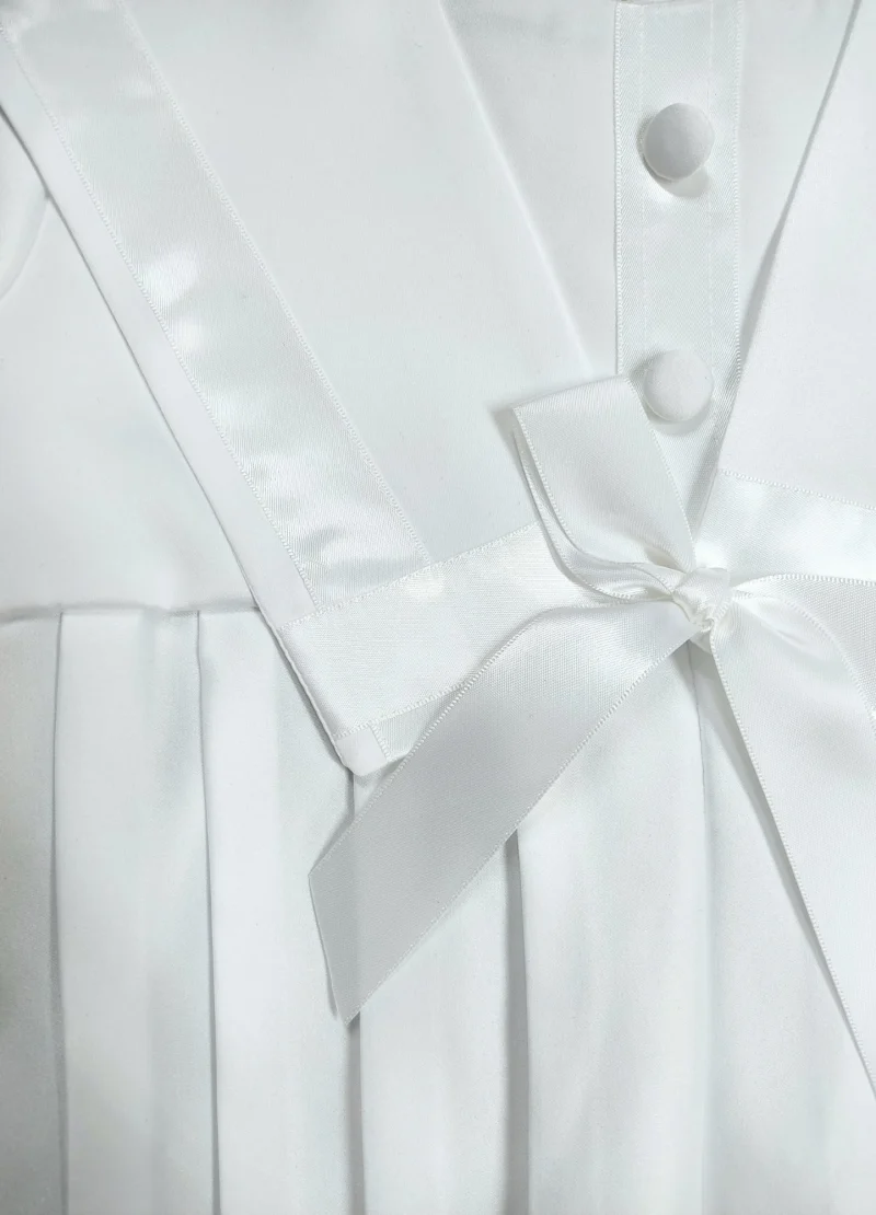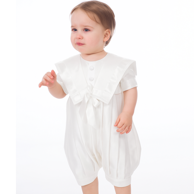 This ensemble is ideal for christening ceremonies. Featuring a luxurious white satin finish, it ensures that your child will exemplify elegance. The outfit is designed in a romper style, easily secured at the horizontal fold between the legs and at the back. It offers ample space to ensure your child’s comfort without feeling confined.