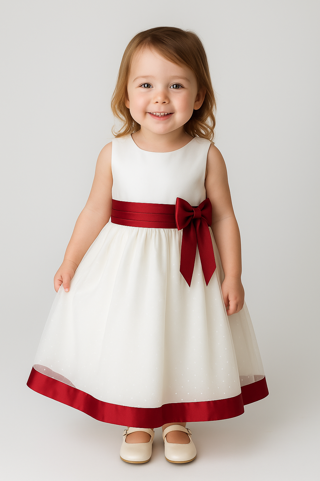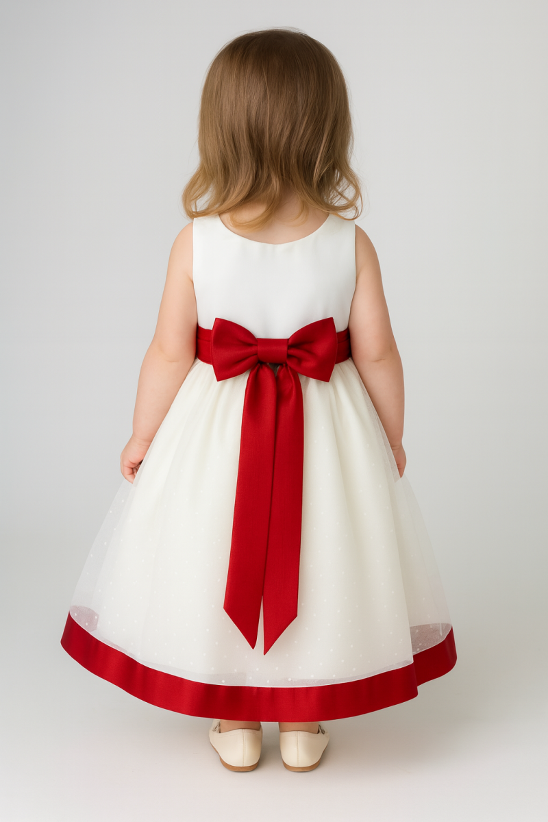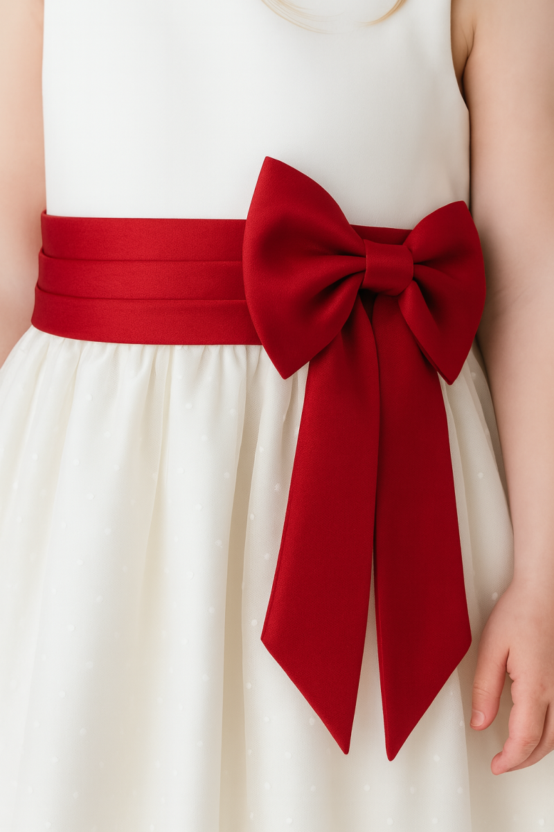 - Bodice: The dress features a fitted bodice that creates a sleek and elegant silhouette. A red sash around the waist adds a refined touch and is finished with a bow at the back, accentuating the waistline.