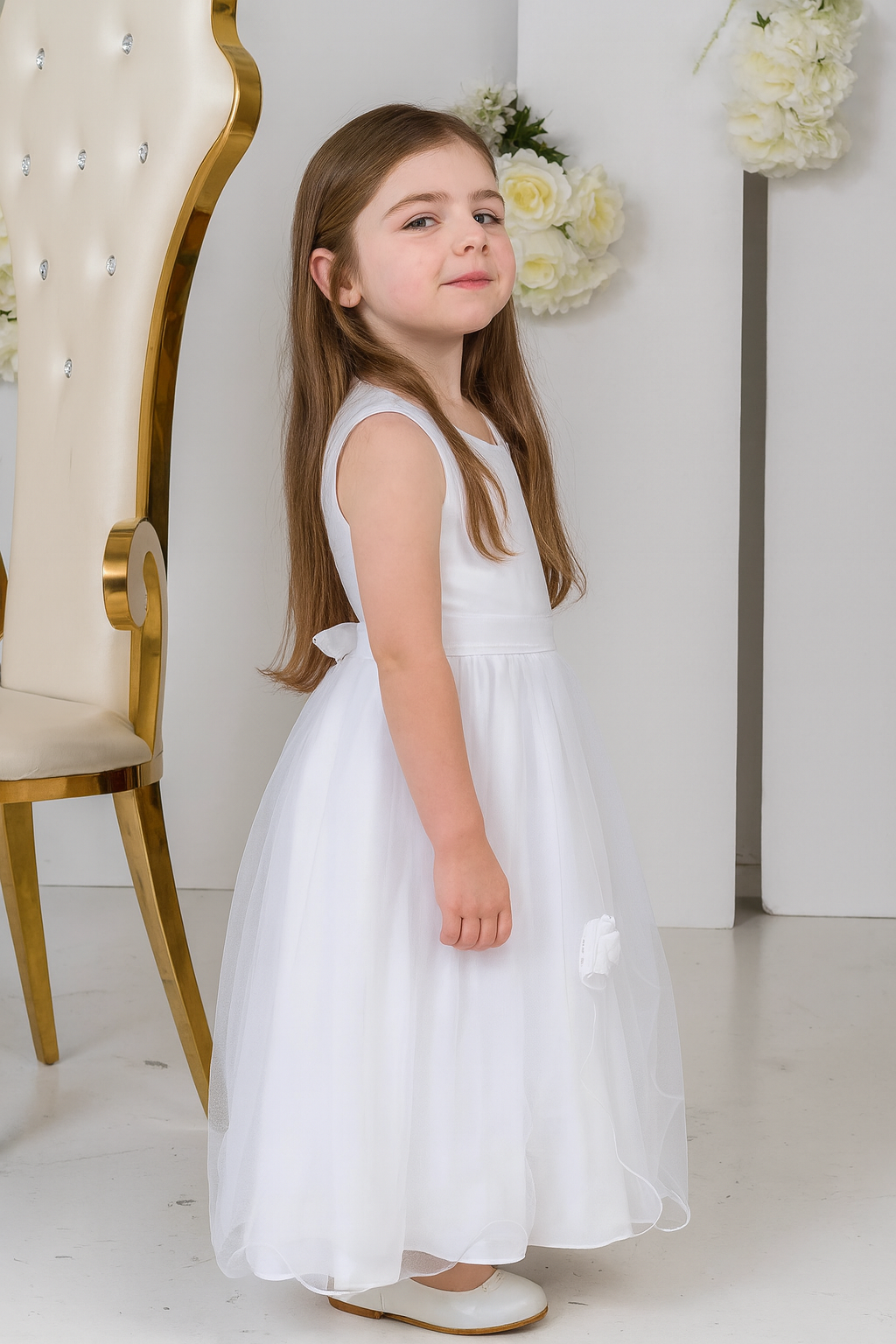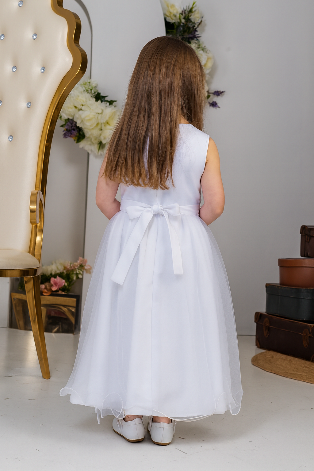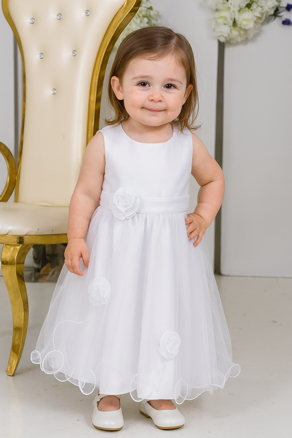 This lovely white sleeveless dress is adorned with a charming white rosebud sash at the waist. Iteskirts are decorated with gathered white rosebuds along the hem, and the dotted mesh adds a touch of flirtiness. The dress’s elegant look is finished with a satin-like white waistband and a big, pretty bow at the back.