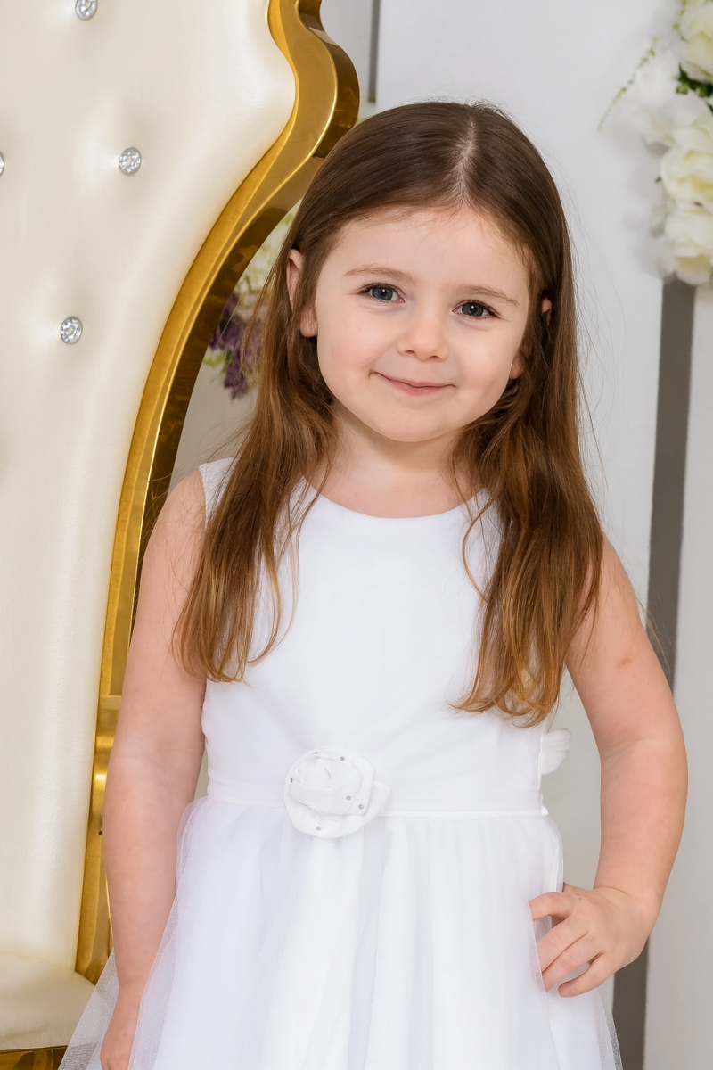 • Waistline: The waistline is accented with a soft white rosebud sash, adding a subtle and charming detail. A white satin-like band at the waist adds sophistication and creates a balanced overall look.