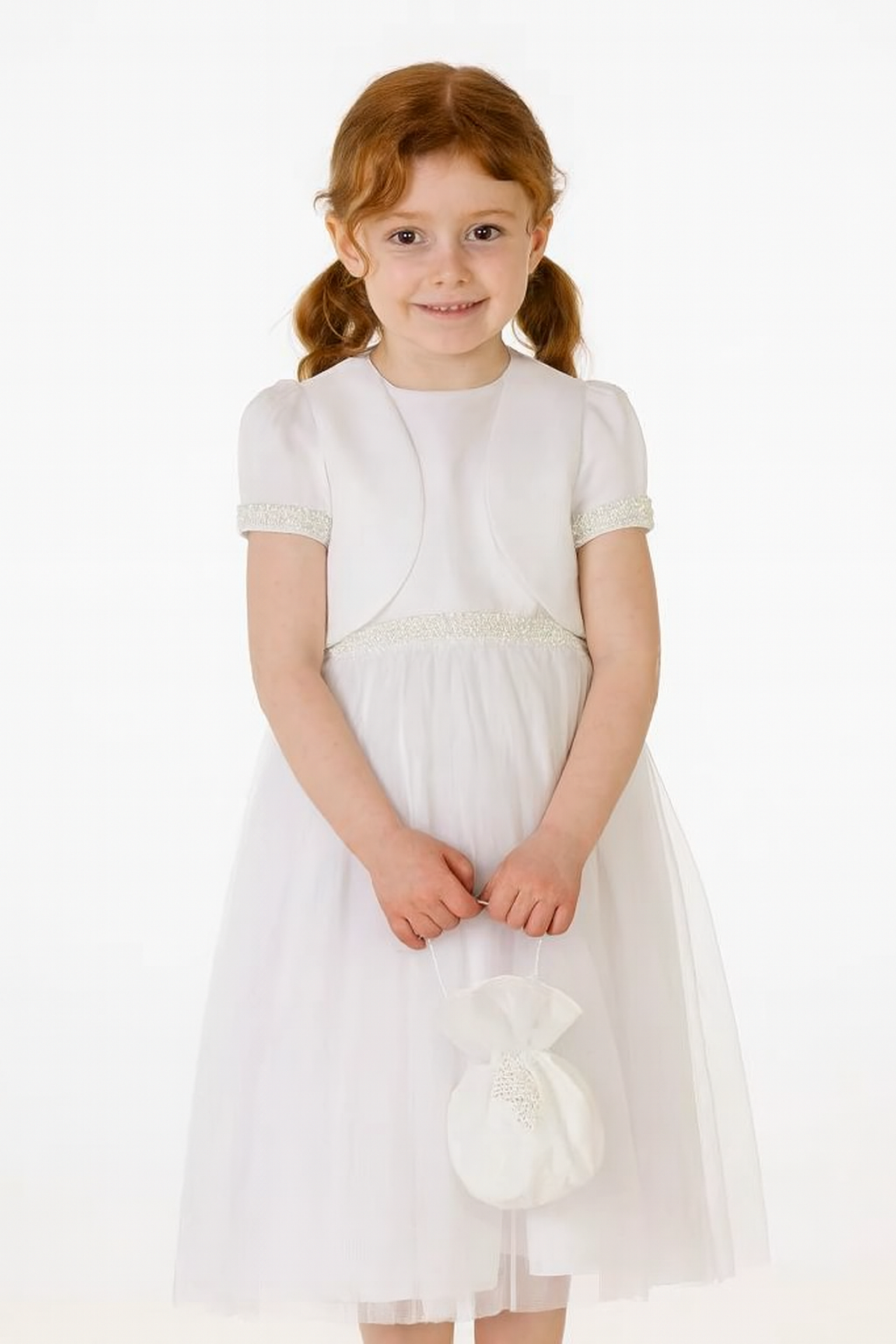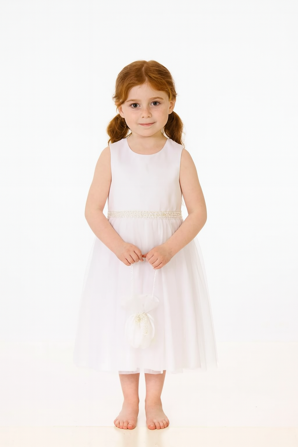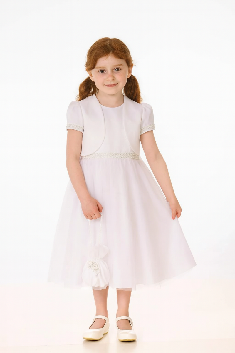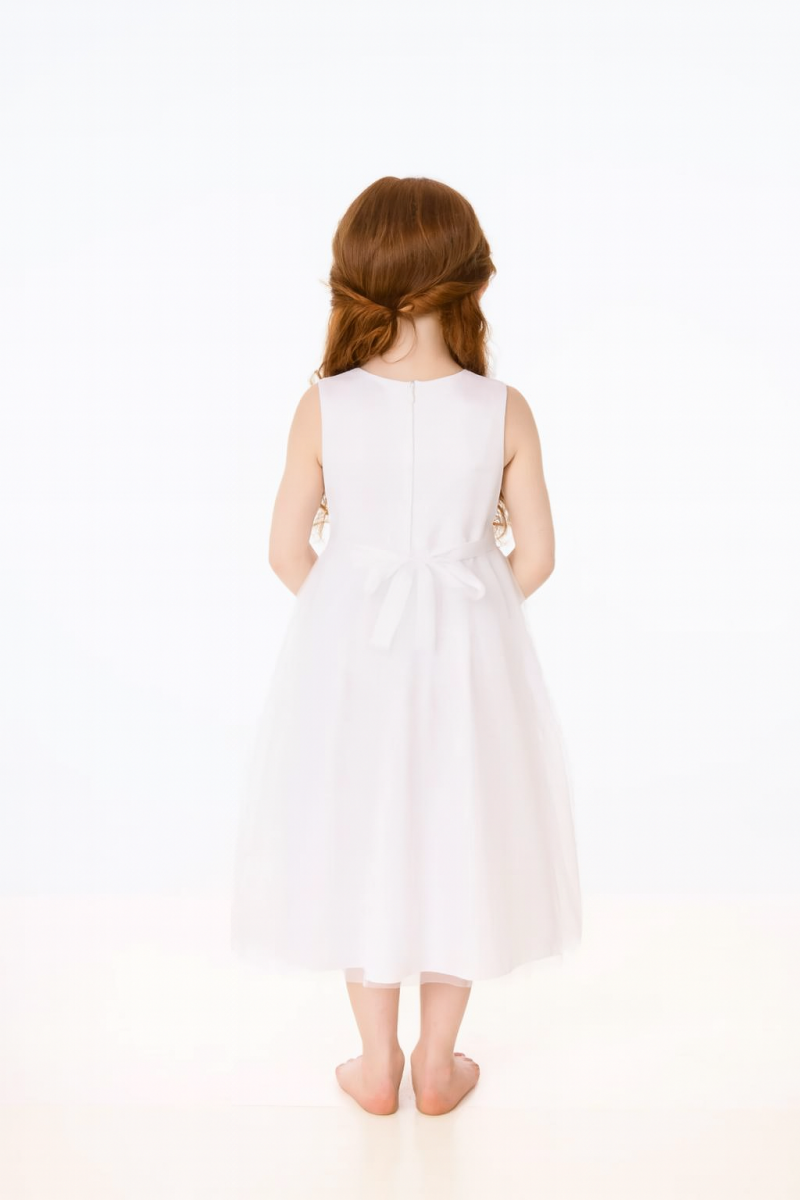 Skirt: A layered white skirt that provides added fullness and a graceful silhouette. - Waistline: Beaded waistline for a subtle touch of sparkle and sophistication.