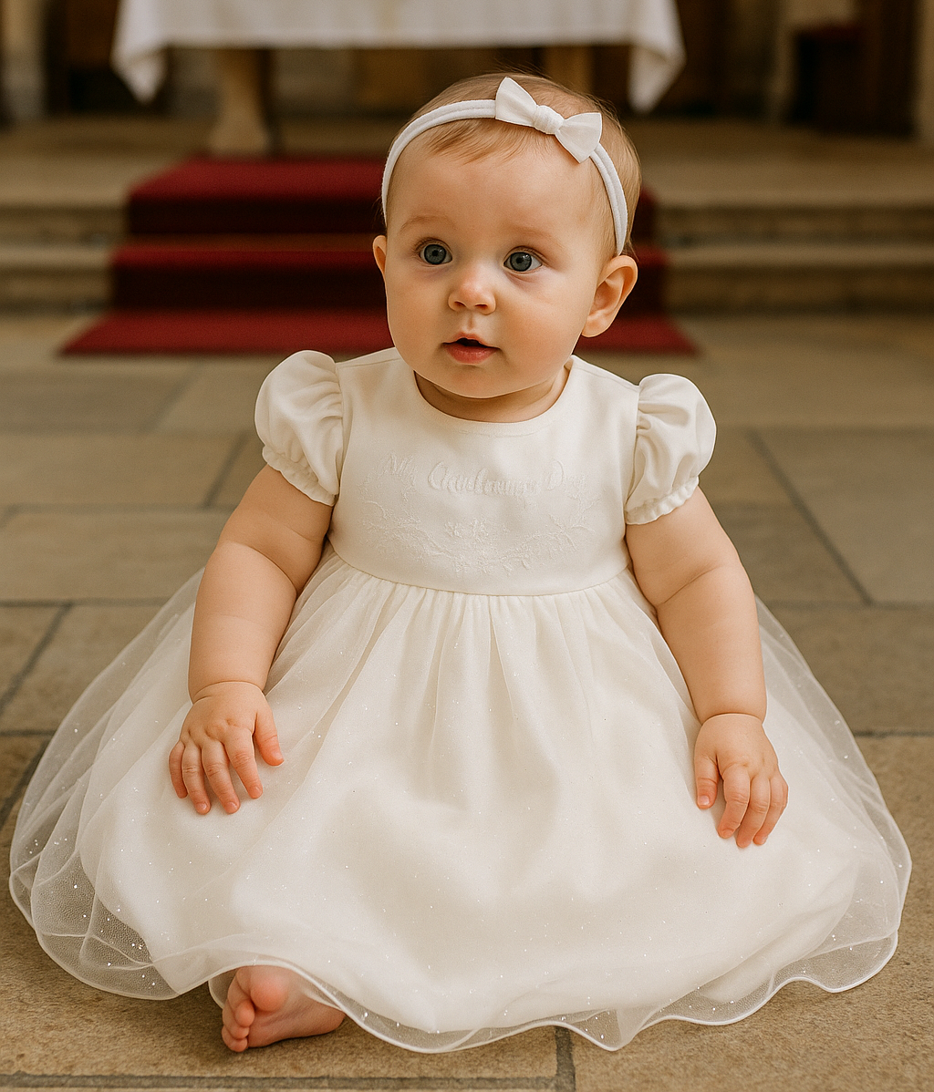 - Overall Look: This stunning ivory gown is both timeless and sophisticated, making it the perfect choice for a baby girl’s Christening day.