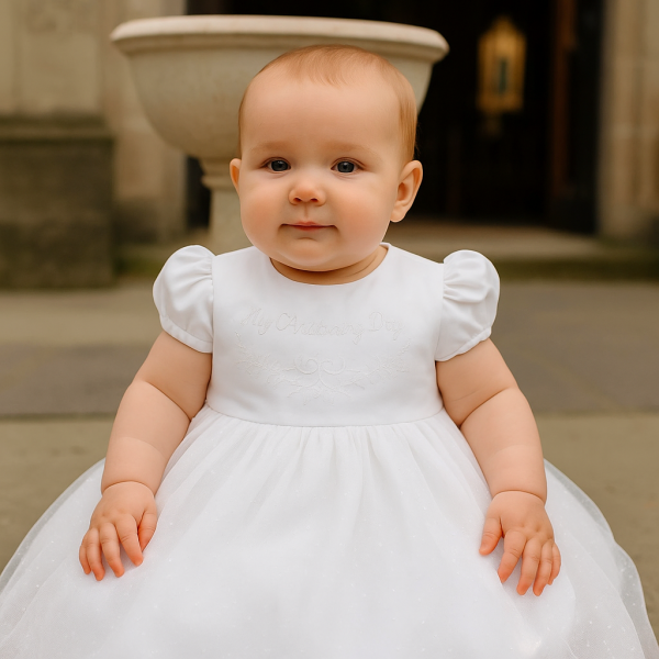 - Bodice: The bodice features the “My Christening Day” embroidery, adding a special touch to this beautiful gown.