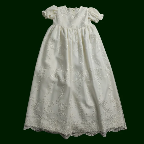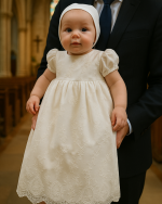 - Overall Look: The floral lace, puffed sleeves, and lace-detailed hem combine to create an elegant, timeless look that is perfect for christenings, baptisms, or any special formal occasion.