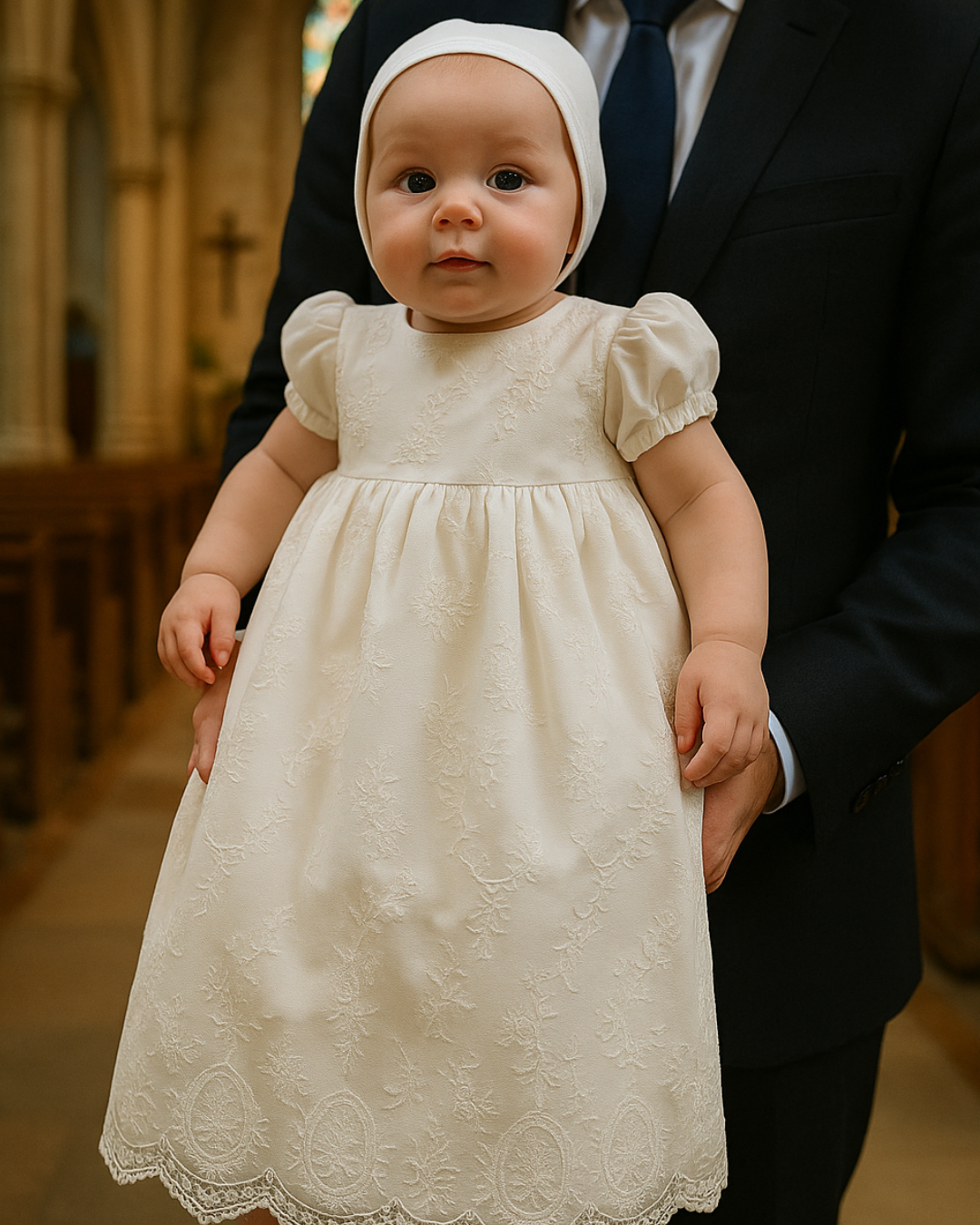 - Bonnet: A matching ivory bonnet is included, completing the christening ensemble with a beautifully coordinated finish.