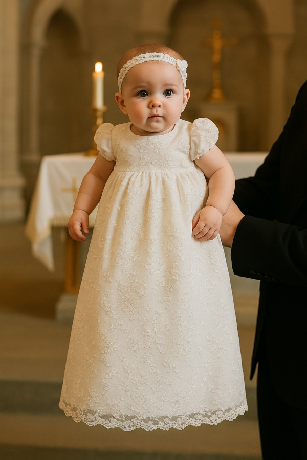 - Overall Look: The combination of floral lace, puffed sleeves, and lace detailing at the bottom creates a refined, elegant appearance that’s perfect for christenings, baptisms, or other formal ceremonies.