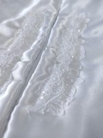 This cape comes with a hood, and an embroidered floral lace and beaded design on the front. With a button fastener. It’s light layered quilted design makes this a perfect addition to keep baby warm and still looking perfect for the occasion.