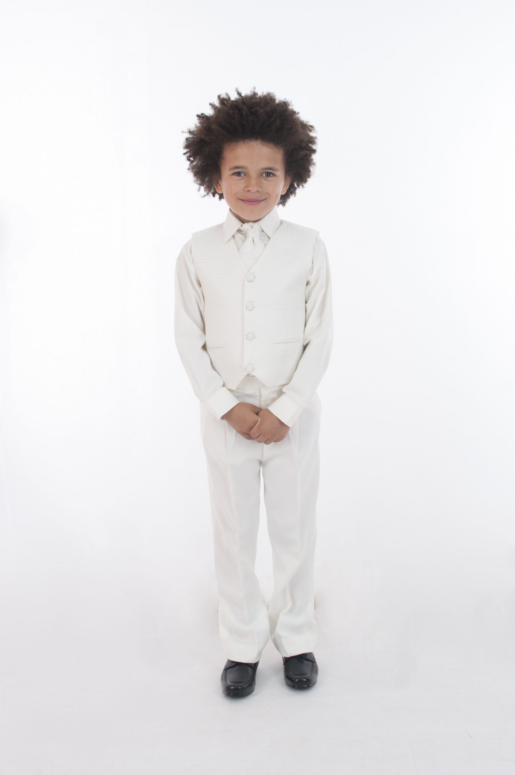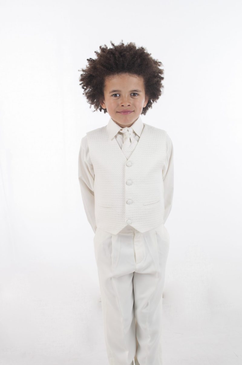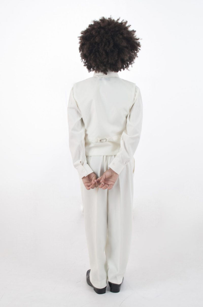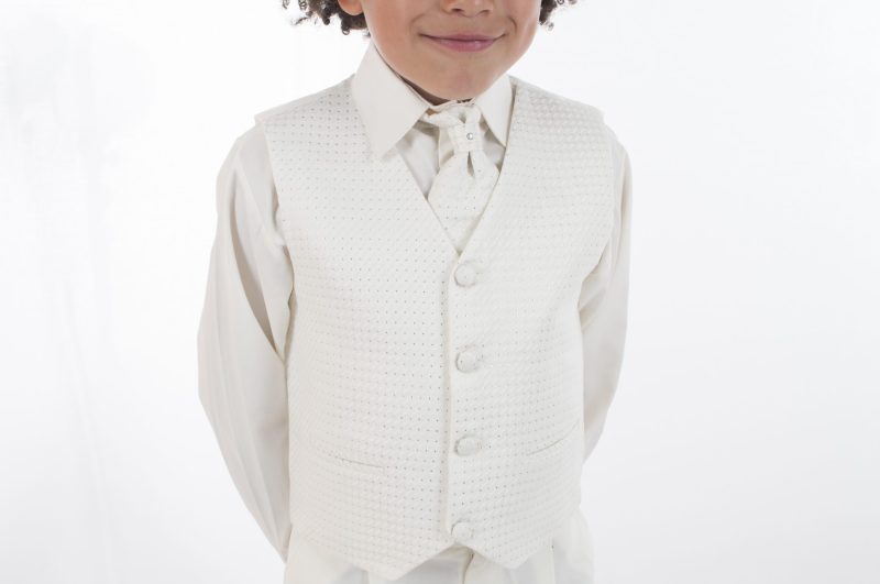 – A cream diamond-patterned waistcoat featuring four front buttons and a silver clasp at the back for size adjustments