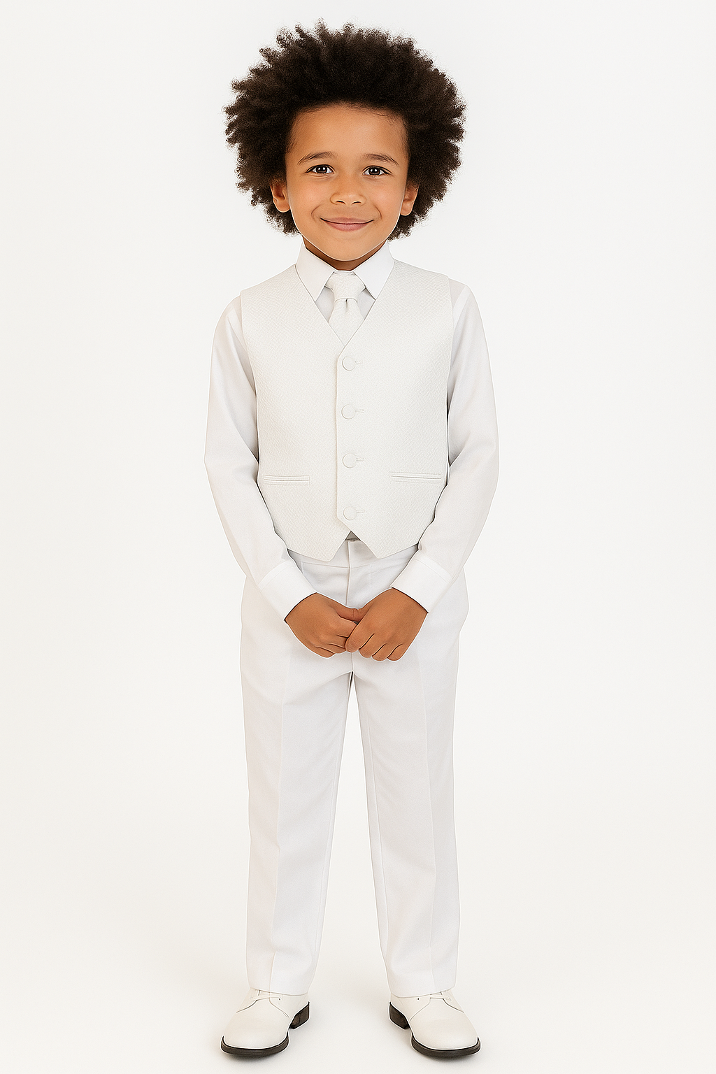 - A white diamond-patterned waistcoat featuring four front buttons and a silver clasp at the back for size adjustments