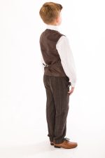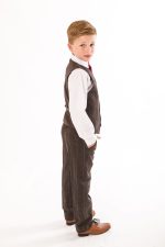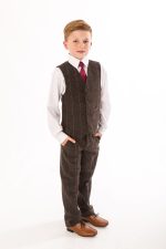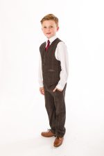 A super stylish Brown check tweed suit, perfect to transform your little boy into a stylish gentleman. This high quality stylish suit consists of a fitted waistcoat and trousers in a stylish Brown tweed with subtle check detailing. A crisp White shirt and Burgundy tie complete the gentleman look.