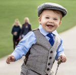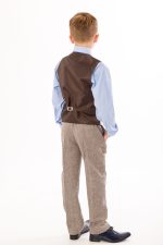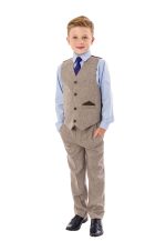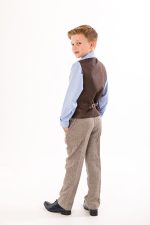A super stylish Brown herringbone tweed suit, perfect to transform your little boy into a stylish gentleman. This high quality stylish suit consists of a fitted waistcoat and trousers in a stylish Brown herringbone tweed. A crisp Blue shirt and Blue tie complete the gentleman look.