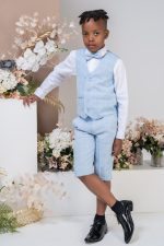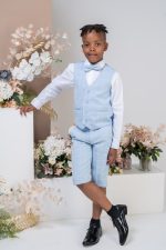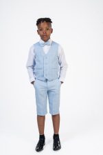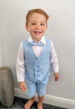 This smart blue check suit comes complete with shorts, waistcoat, shirt and a bow tie. Perfect for any occasion.