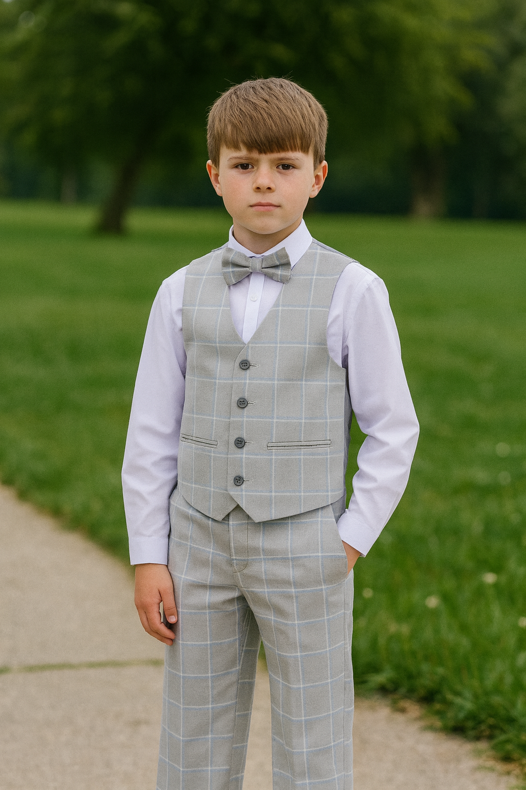 This smart light grey check suit comes complete with shorts, waistcoat, shirt and a bow tie. Perfect for any occasion.