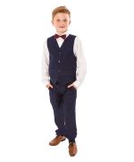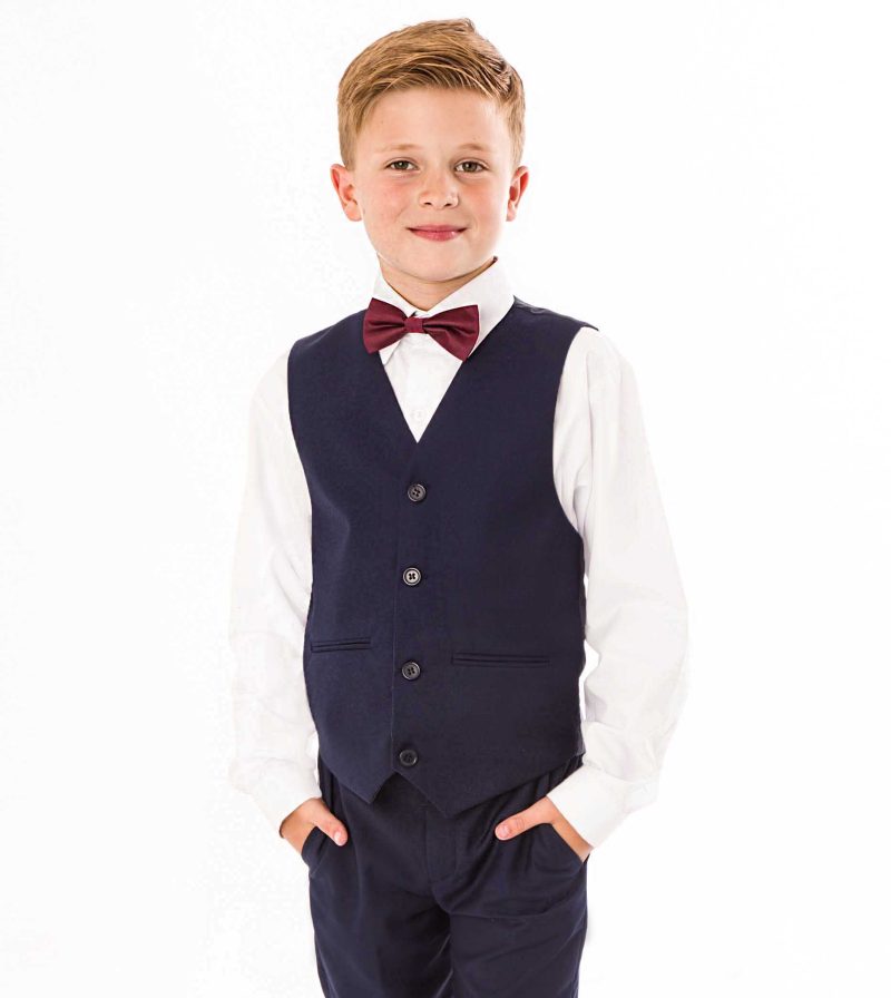 This stylish four-piece navy suit offers a sophisticated look perfect for a summer wedding. Crafted from high-quality, lightweight fabric, it includes a long-sleeve white collar shirt, elasticated trousers, a four-button waistcoat, and a wine-coloured satin-finished bow tie to complete the ensemble.