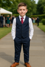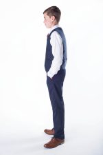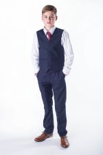 This suit consists of a fully lined navy waistcoat with an adjustable clasp for sizing, a white full sleeved collar shirt, navy elasticated trousers and a burgundy polka dot tie for that final touch