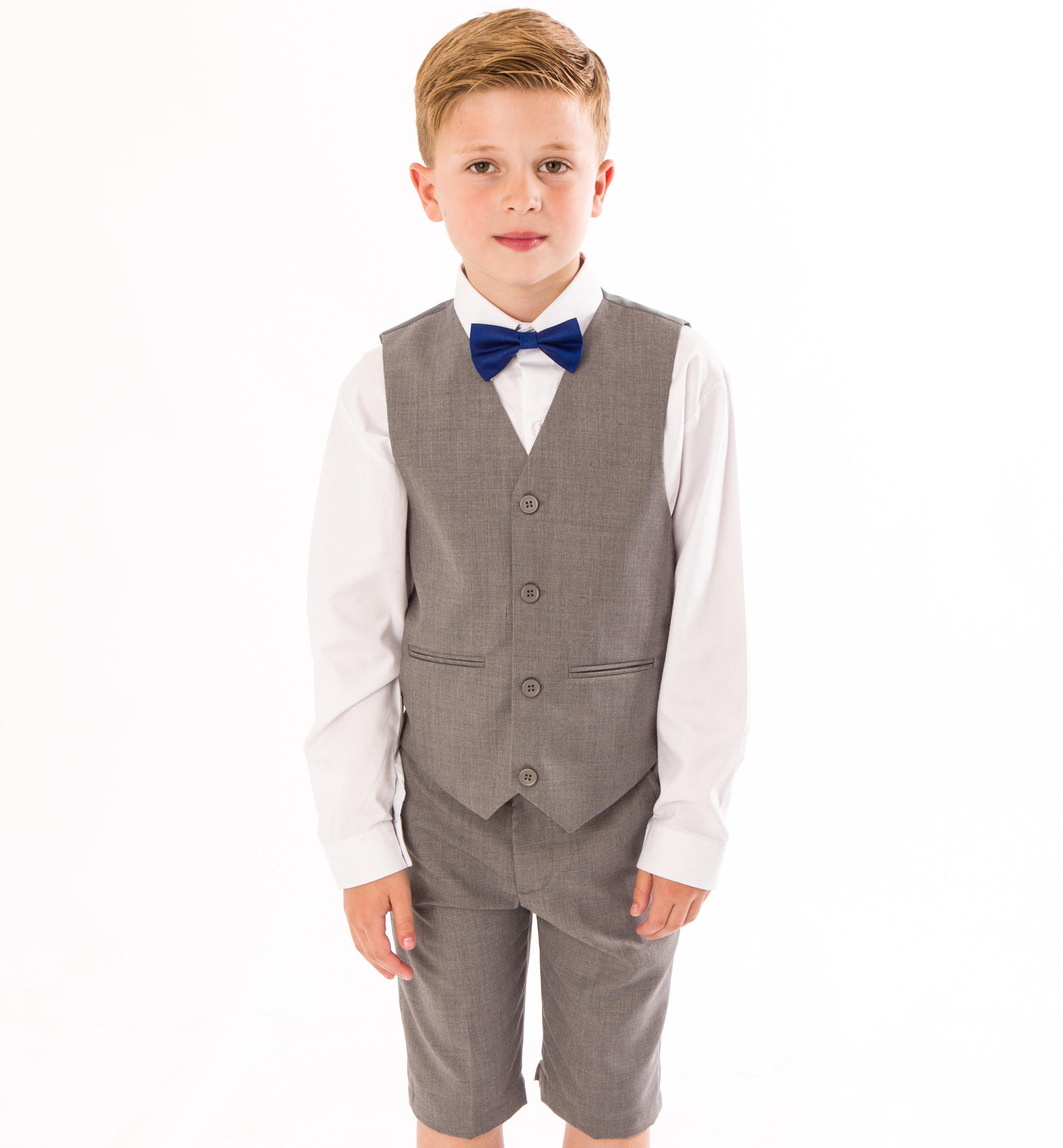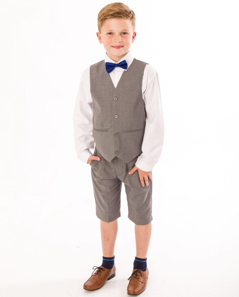 This stylish 4-piece grey short suit offers a sophisticated look for the perfect summer wedding. Crafted from high-quality, lightweight fabric, the set includes a full-sleeve white collar shirt, elasticated shorts, a four-button waistcoat, and a deep blue satin-finished bow tie to complete the ensemble.