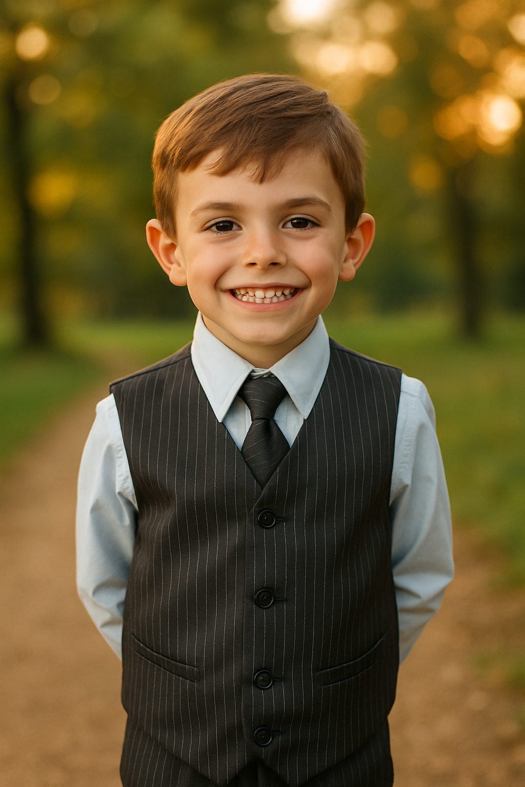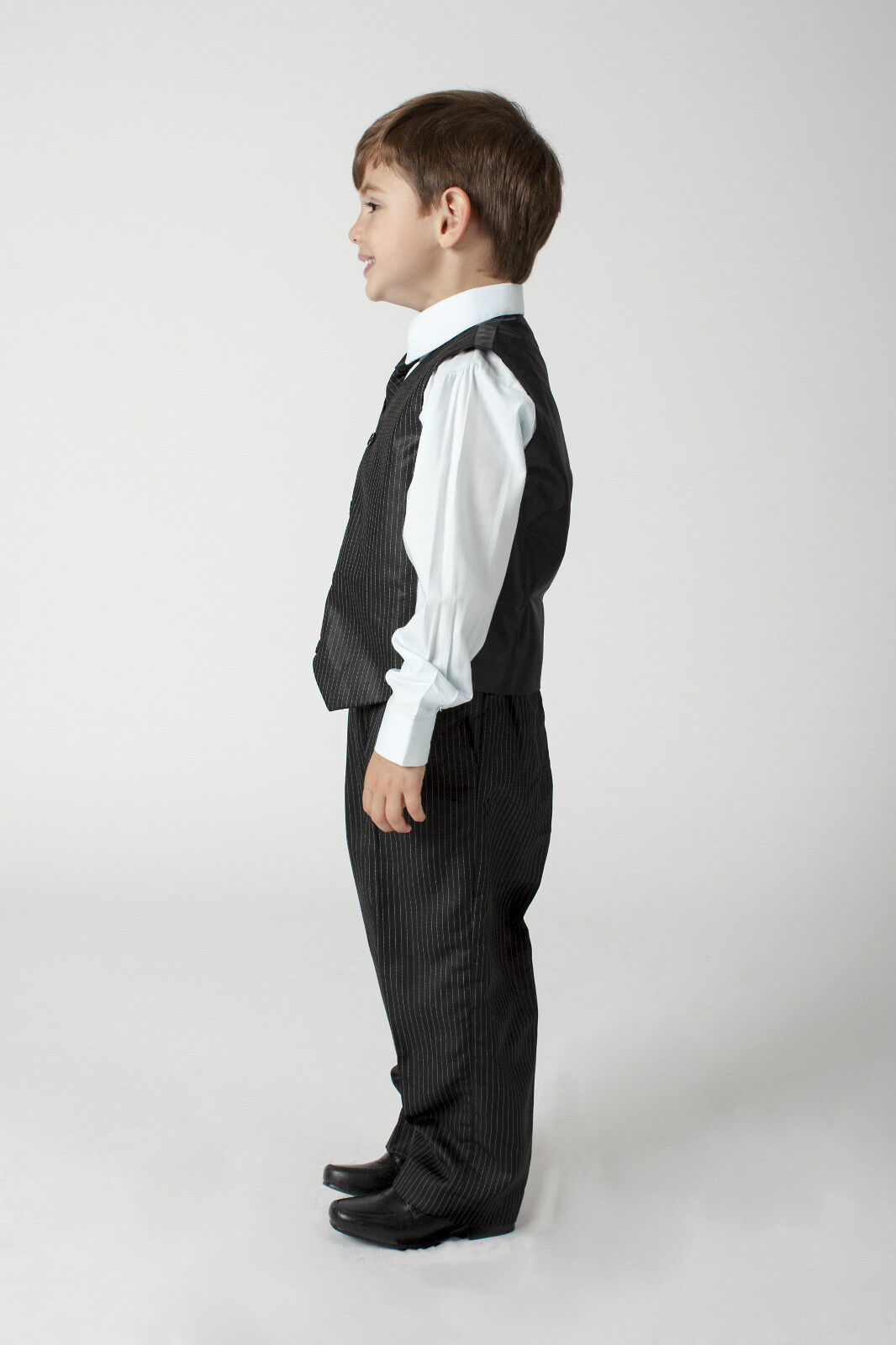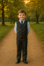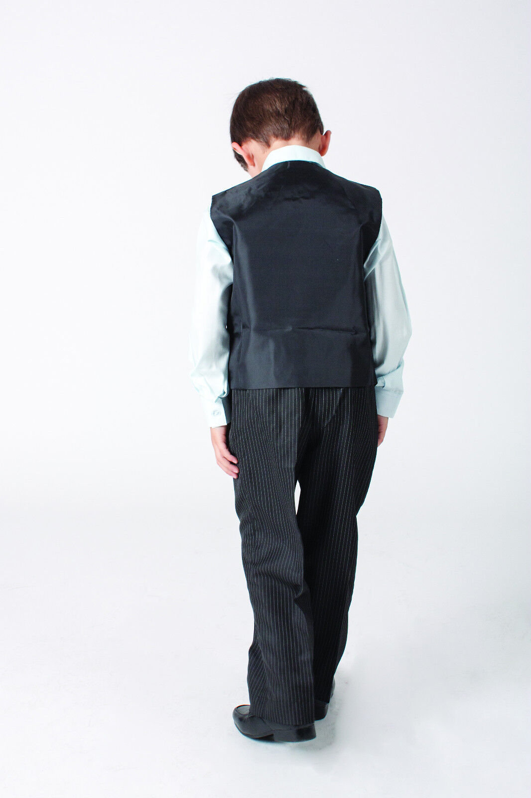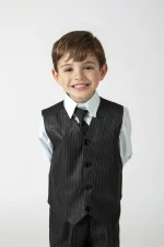 The suit consists of a full sleeve, collar shirt, elasticated trousers, and a waistcoat with a simple satin finish and 3 buttons and a matching tie to finish the look.