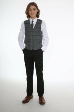 – Grey and white, with blue checked waistcoat