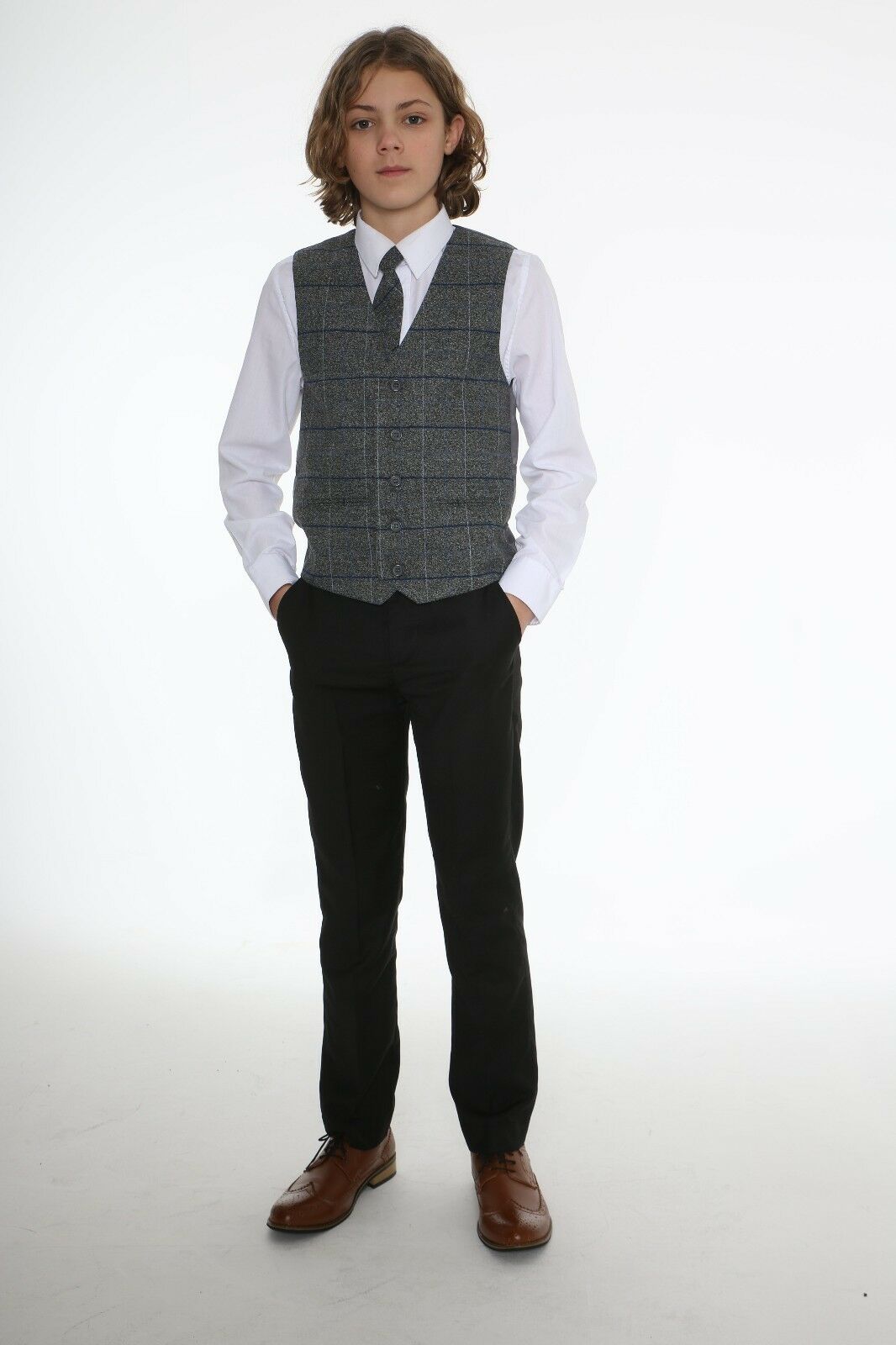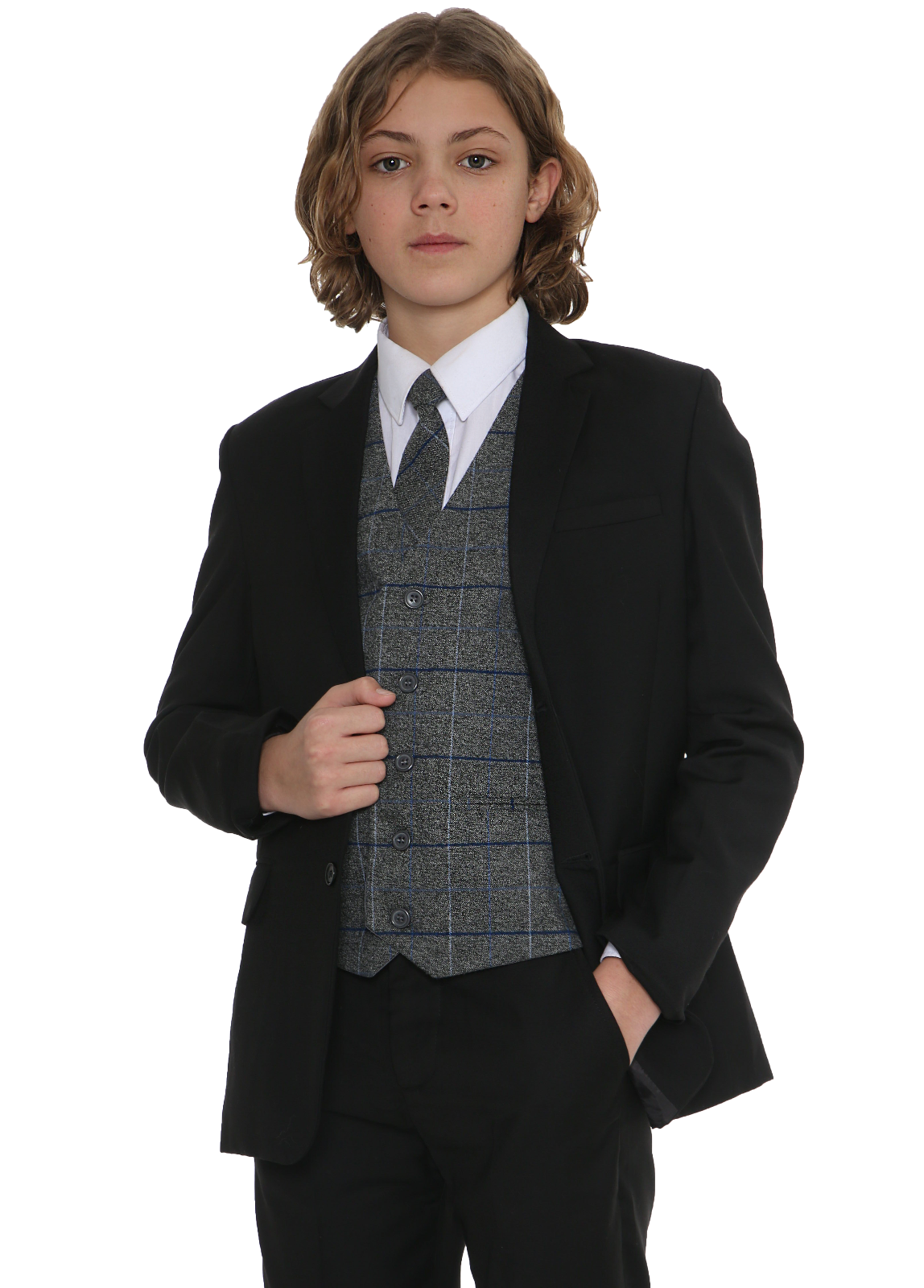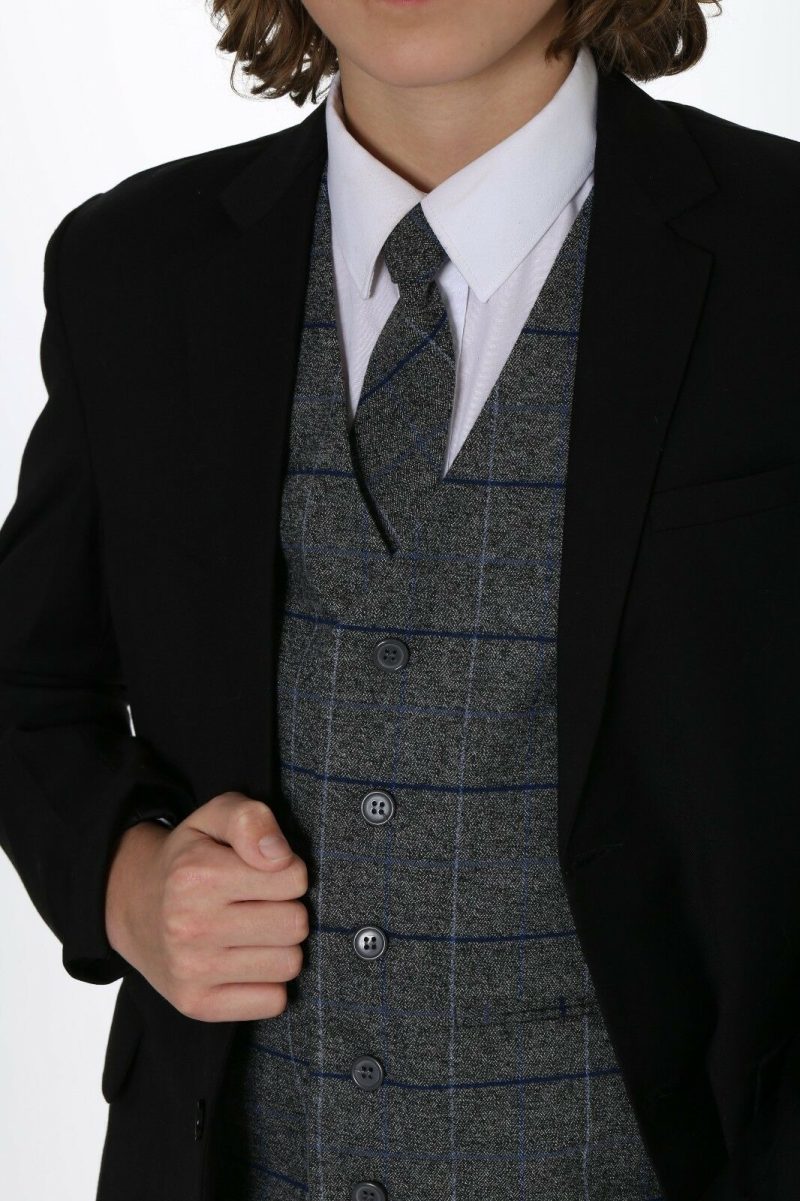 This stylish black suit is highly attention-grabbing, featuring a checkered waistcoat and coordinated tie. The waistcoat’s design incorporates various lines of white and grey, making it the standout piece of the ensemble. Subtle hints of blue throughout the pattern complement the black jacket and trousers. The entire suit is completed with a crisp white shirt.