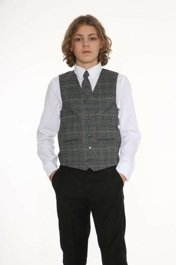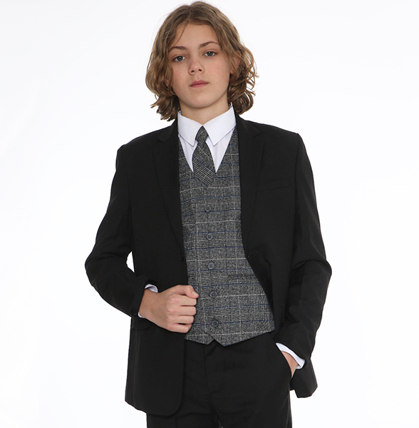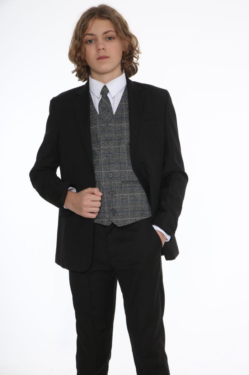 This stylish black suit features a striking checked waistcoat and coordinating tie. The waistcoat’s design incorporates various lines of white and grey, making it the focal point of the ensemble. Subtle hints of blue within the pattern complement the black jacket and trousers. The suit is completed with a crisp white shirt.