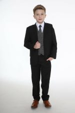 This Stylish Black suit is incredibly eye catching with its Chequered Waistcoat and matching tie. The design of the waistcoat has various lines of White and Grey which makes this waistcoat the dominant piece of the suit. Subtle hints of grey running throughout the pattern compliment the black jacket and trousers. The whole suit is finished off with a crisp white shirt