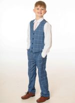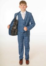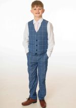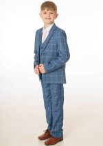 Lockdown the look in this super stylish boys 5 piece blue check suit. The crisp white shirt and light pink tie contrast flawlessly with the bright blue suit colouring creating the perfect stand out outfit.
