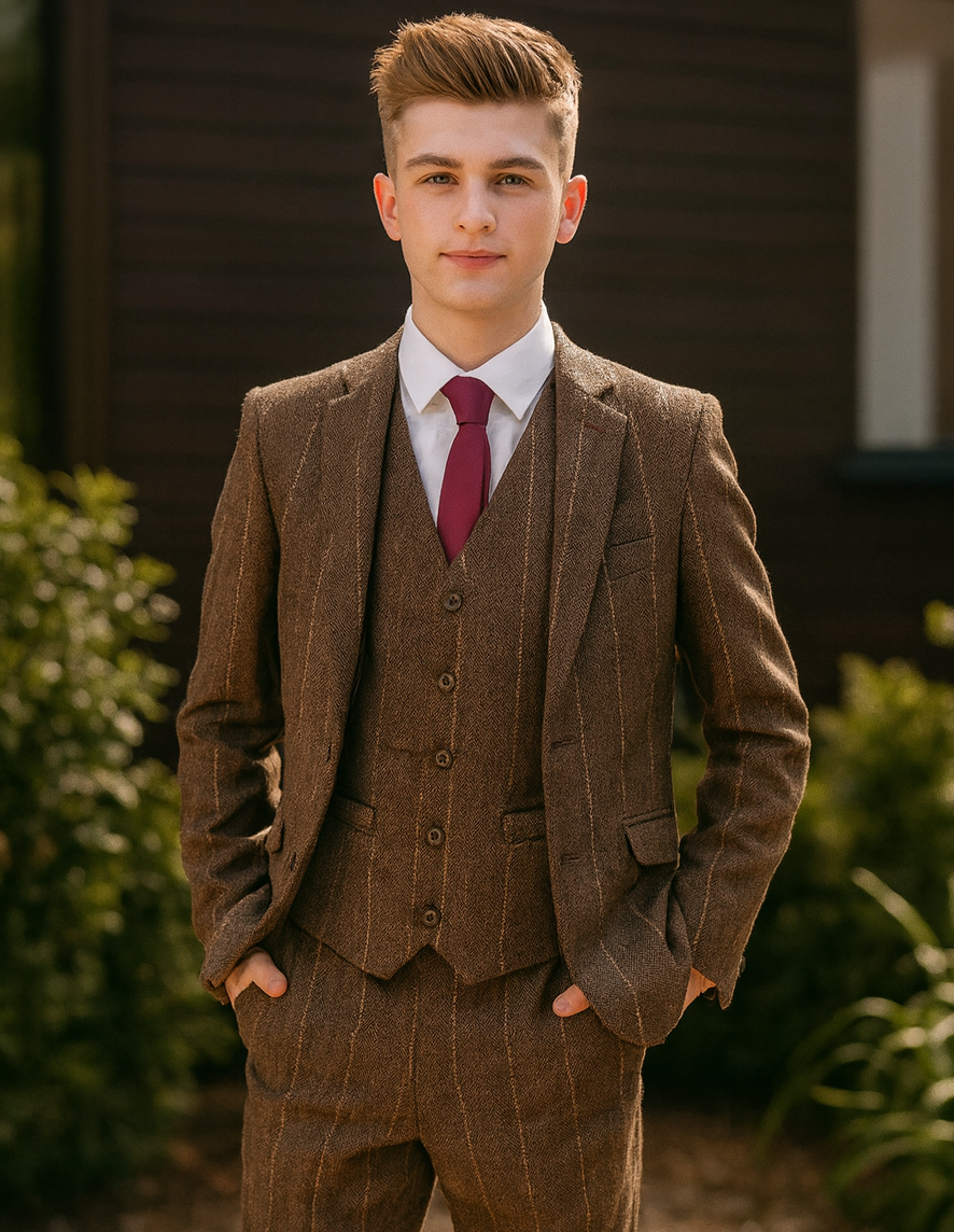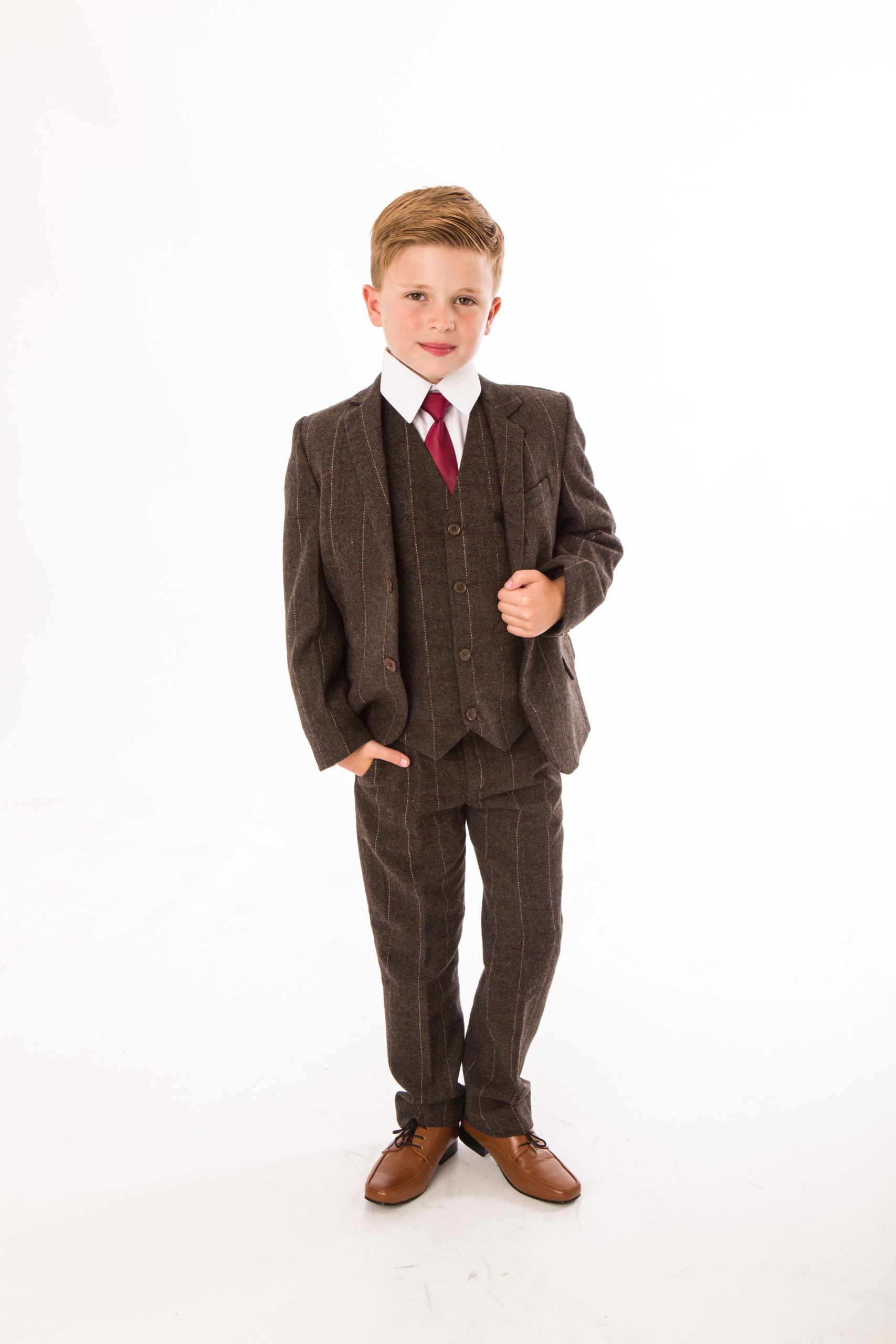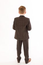 This wonderfully styled suit is the perfect suit for those looking for a tweed suit. This check style suit is a 5 piece suit and comes with a finely crafted tweed blazer and waistcoat, tweed trousers, a white shirt and a red tie to finish off this smart look. Well stitched and high quality material. The suit includes a beautifully stitched detailed pocket to finish the look of a fine tailored boys suit. Perfect for any formal occasion or wedding to make your little boy stand out with class and elegance.