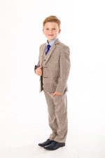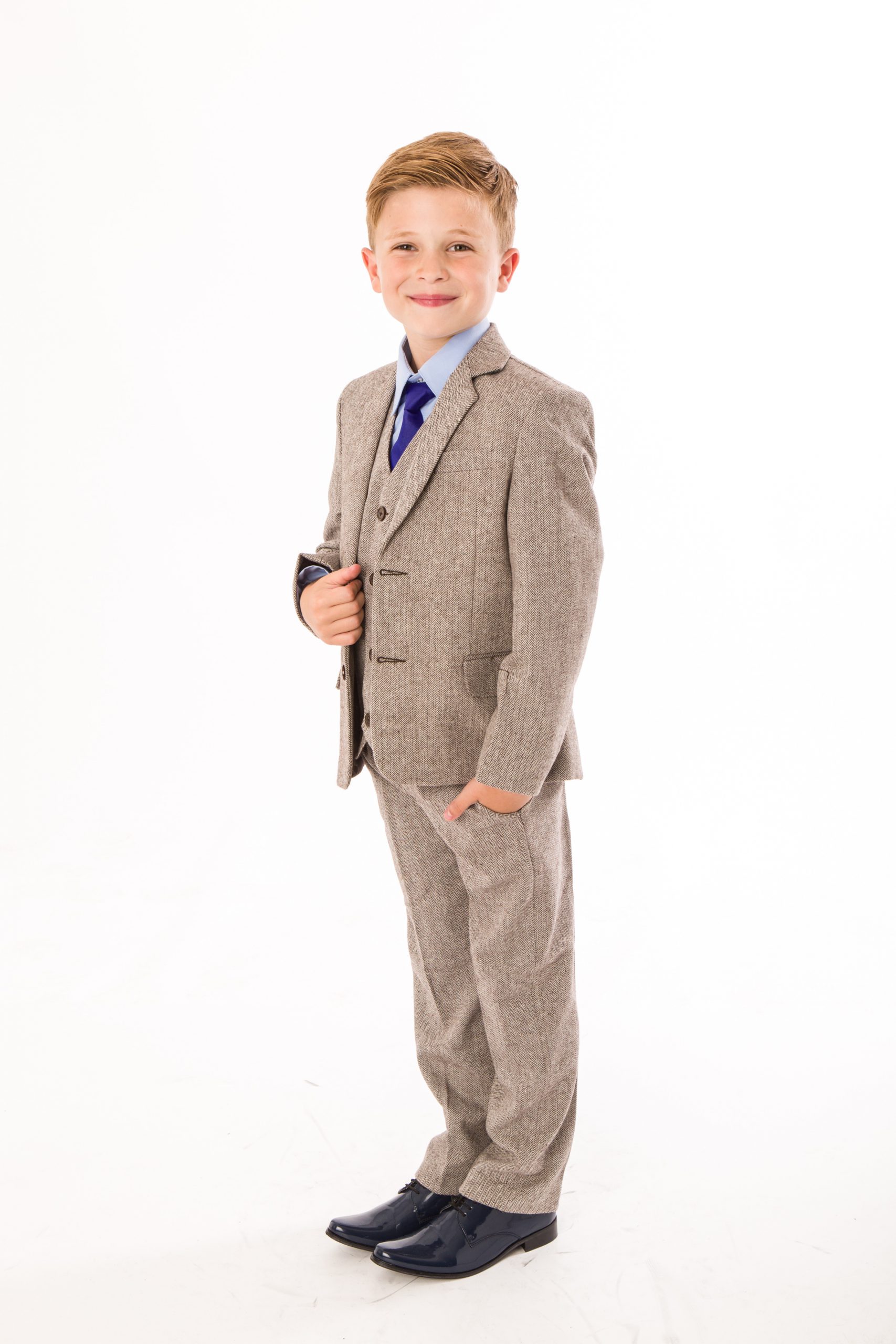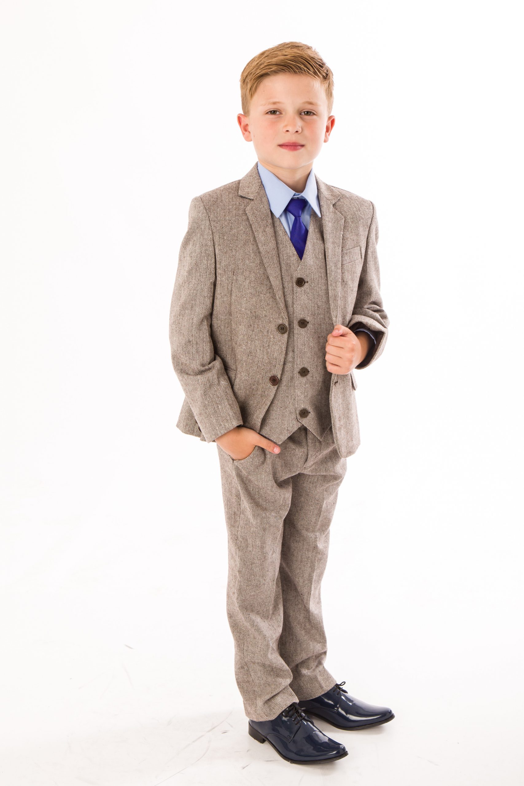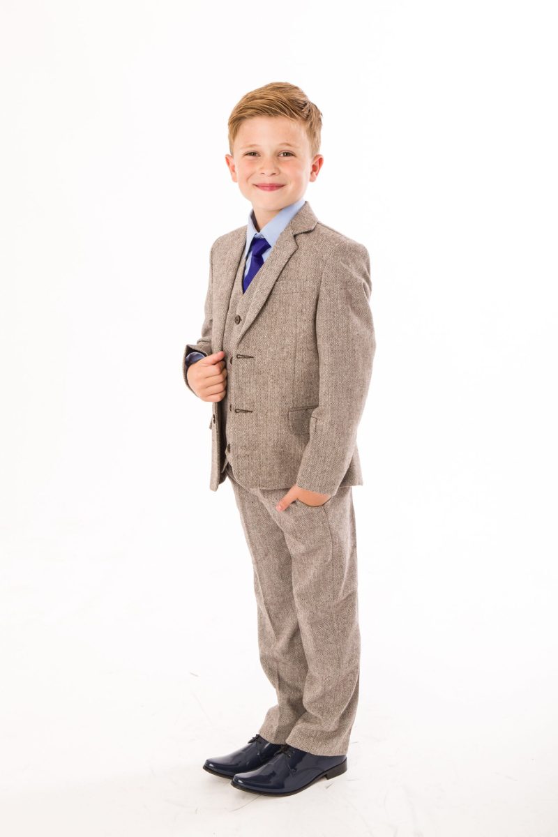This meticulously crafted classic tweed suit features a sophisticated herringbone brown design. It is a five-piece ensemble that includes a finely tailored tweed blazer and waistcoat, matching tweed trousers, a blue shirt, and a coordinating blue tie, creating a polished and refined appearance. The suit also features detailed stitching on the pocket, reflecting high-quality craftsmanship. Made from premium materials, this suit is suitable for any special occasion. With the current trend of herringbone tweed, it is sure to make a distinguished impression.