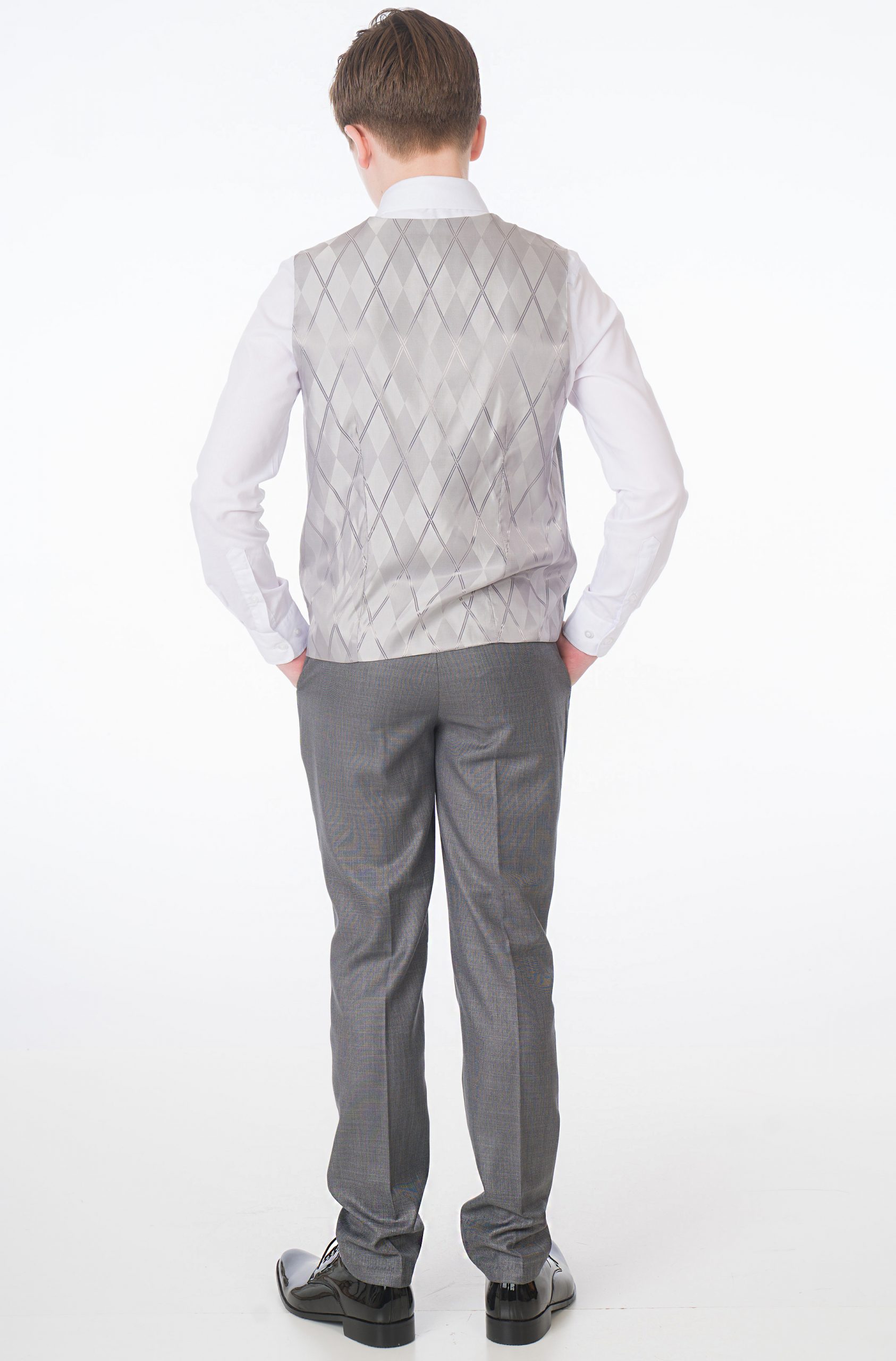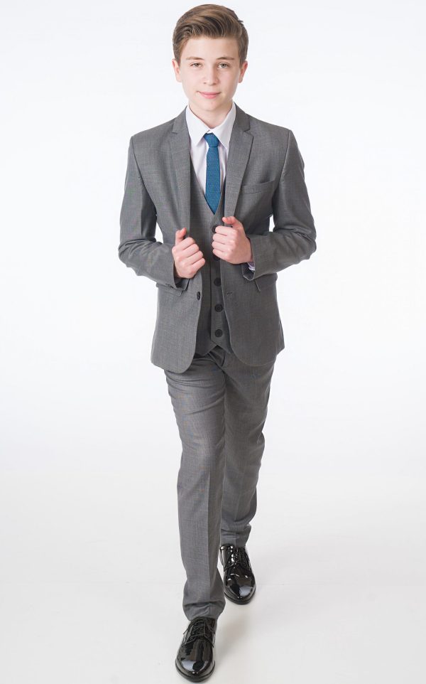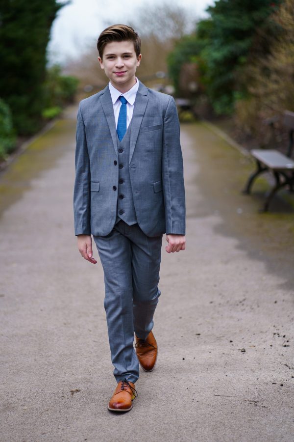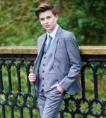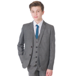 A high-quality luxury suit designed by Milano Mayfair. This complete five-piece slim-fit ensemble includes a two-button jacket, trousers with an adjustable waist, a matching four-button waistcoat, a crisp white shirt, and a coordinating tie. Ensure your young gentleman looks sharp and makes every occasion special with this suit. The premium quality is complemented by its presentation in a Milano Mayfair suit bag.