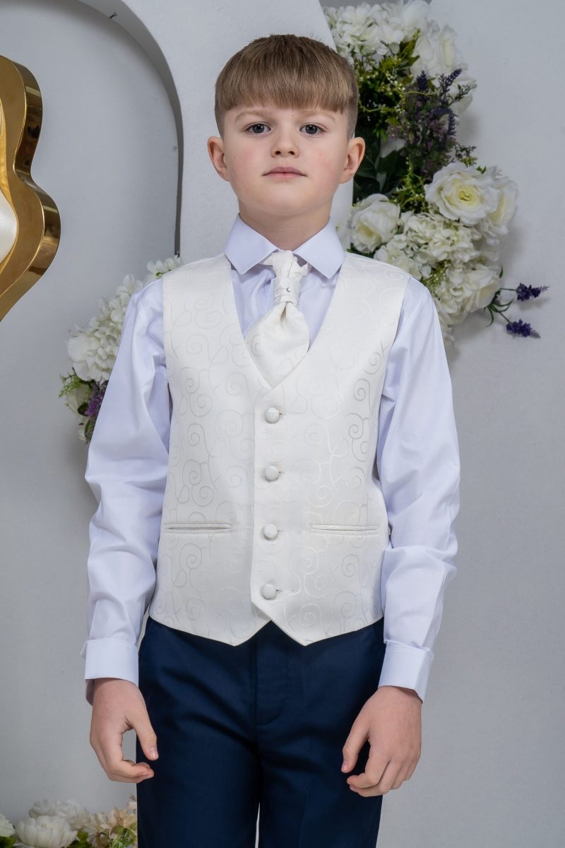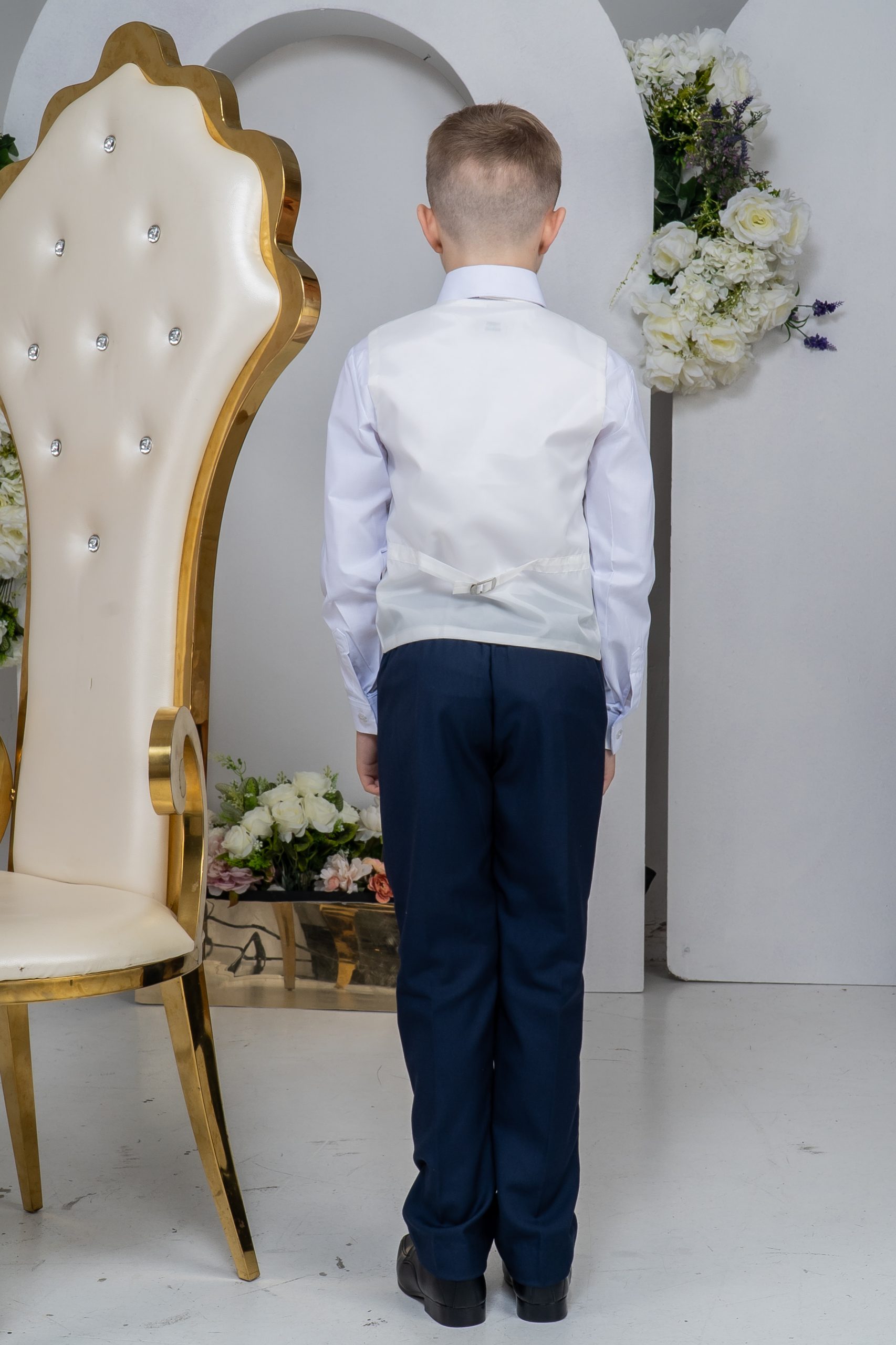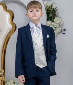 This stunning 5 Piece Swirl suit is perfect for every formal occasion, and in the beautifully popular combination of grey with cream, your boy will truly shine and stand out confidently in any crowd. Crafted with care, this suit includes a comfortable cotton shirt, a gorgeous cream swirl patterned waistcoat with a matching tie, and elasticated navy trousers complemented by a stylish navy jacket- an outfit that expertly combines elegance with charming flair.