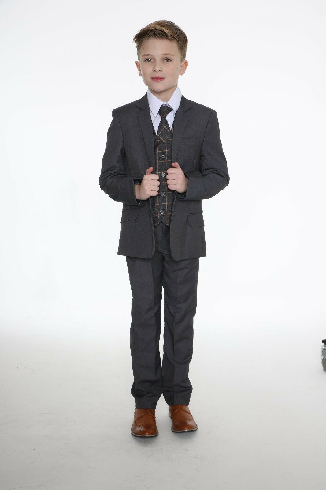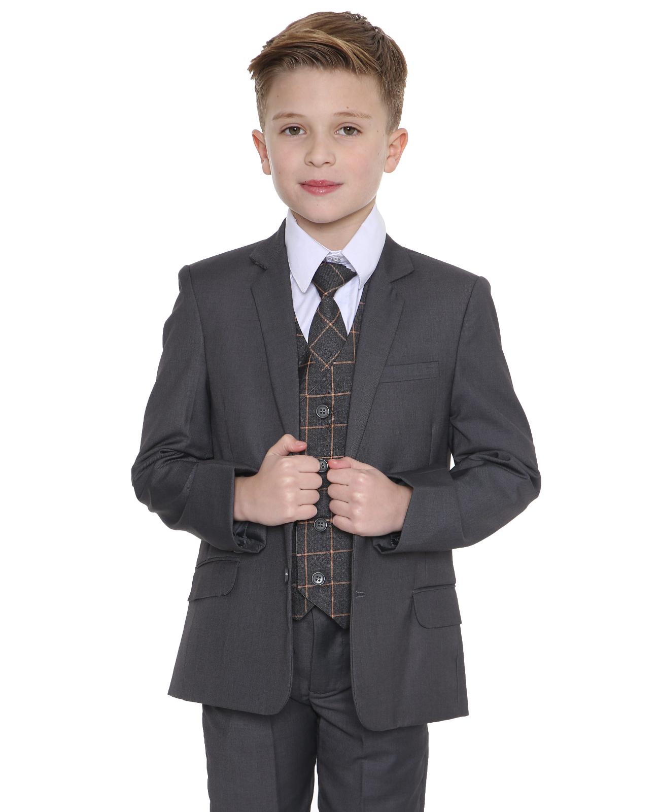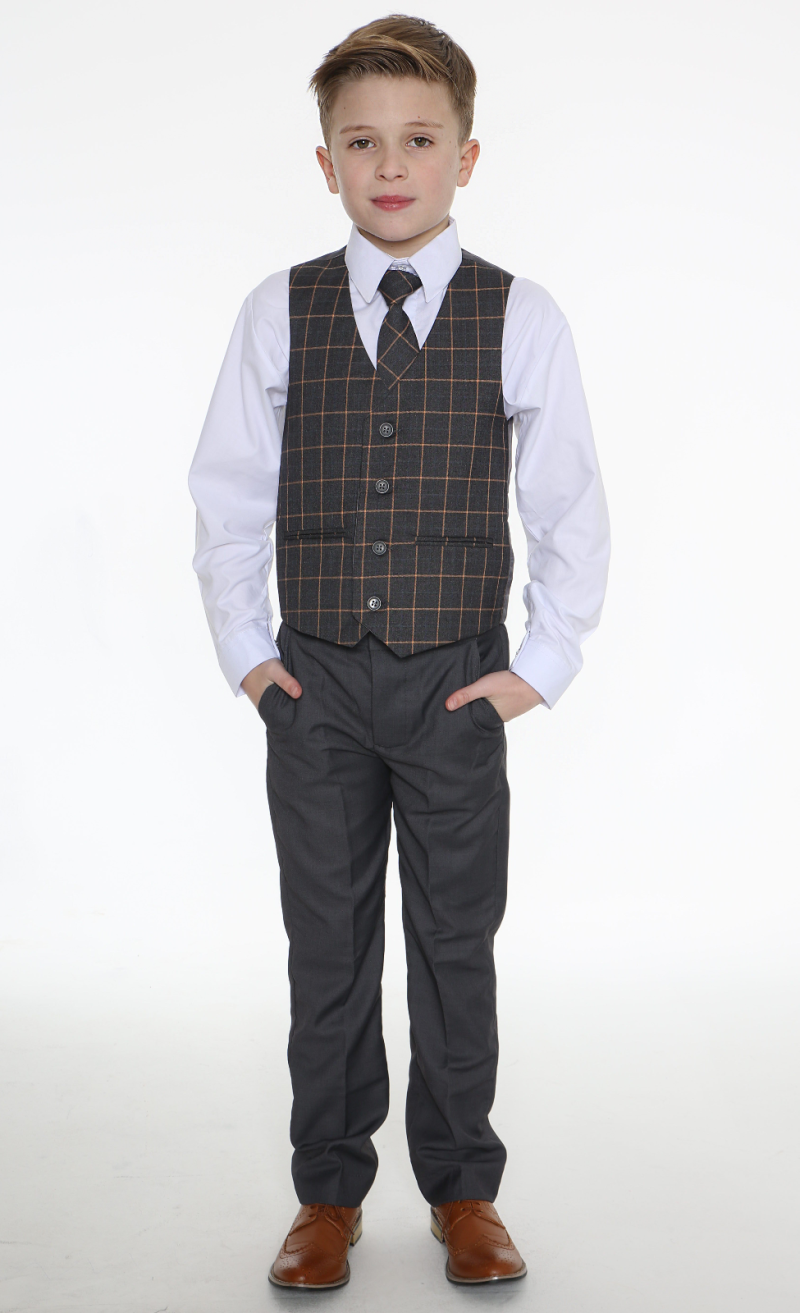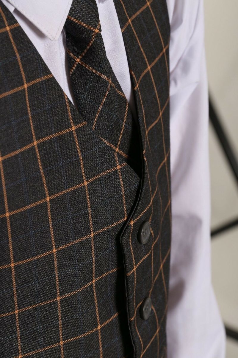 This stylish grey suit is highly striking, featuring a checkered waistcoat and a coordinating tie. The design of the waistcoat includes various lines of white and grey, making it the focal point of the ensemble. Subtle accents of grey are woven throughout the pattern, complementing the grey jacket and trousers. The suit is completed with a crisp white shirt.